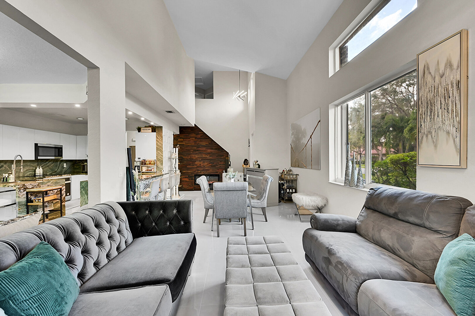 Baseboards Wall, Drywall, Fireplace, High Ceiling, Marble Finish Floor, Natural Light, Recessed Lighting, Vaulted Ceiling, Vent, Baseboards Wall, Natural Light, Recessed Lighting, Vaulted Ceiling