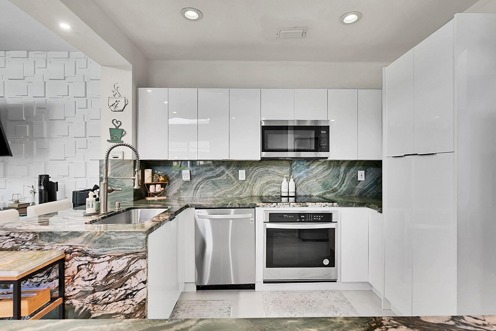 Brick Wall, Drywall, Fireplace, Flat Panel Cabinets, Kitchen Bar, Kitchen Peninsula, Natural Light, Opens To Living Area, Recessed Lighting, Stone Countertops, Stone Wall, Tile Floor, Vent, Whole House Fan, Drywall, G Shaped Kitchen, Kitchen Peninsula, Stone Countertops, Vent