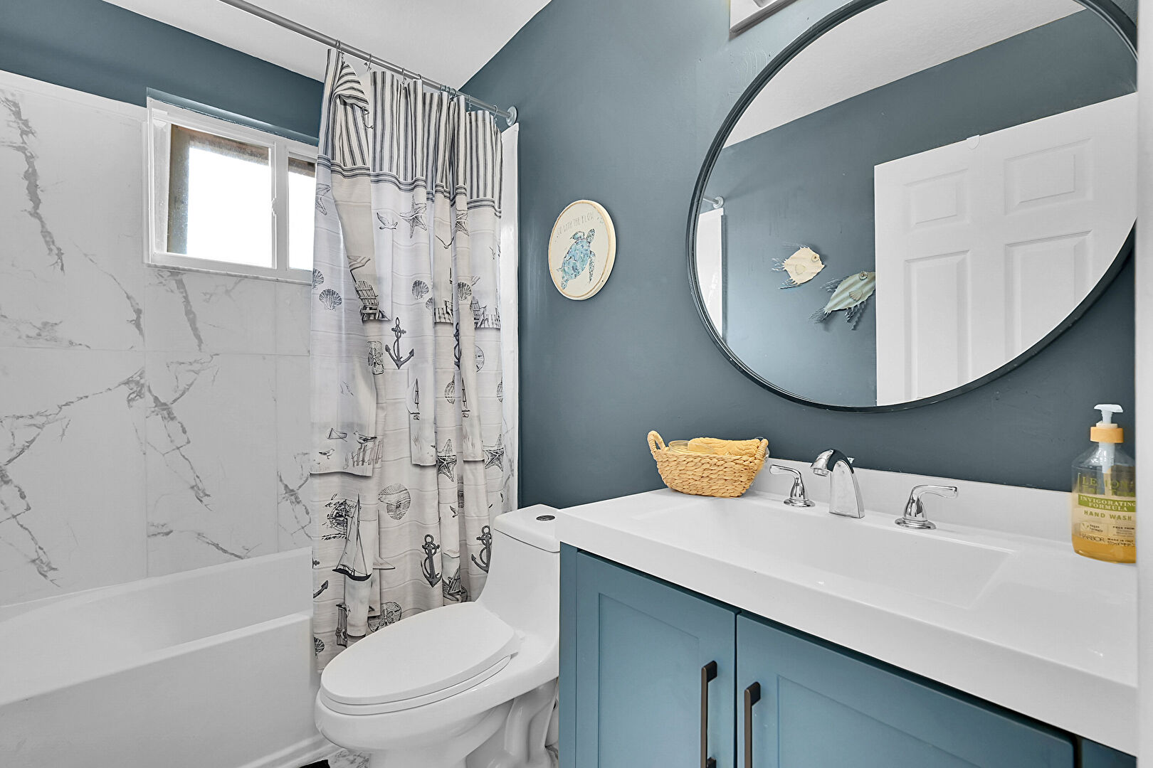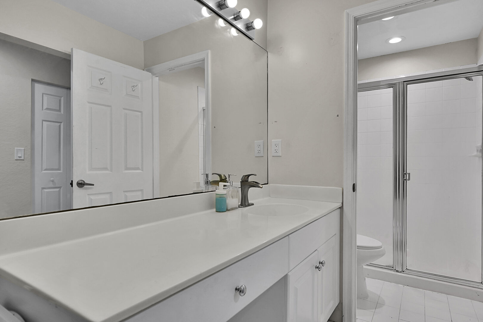 Baseboards Wall, Combined Bath Shower, Drywall, Full Bathroom, Recessed Lighting, Tile Wall, Vanity, Half Bathroom, Natural Light, Recessed Lighting, Tile Floor, Vanity