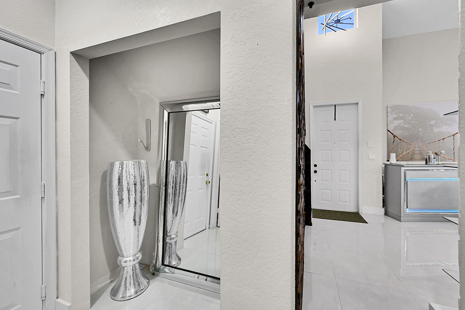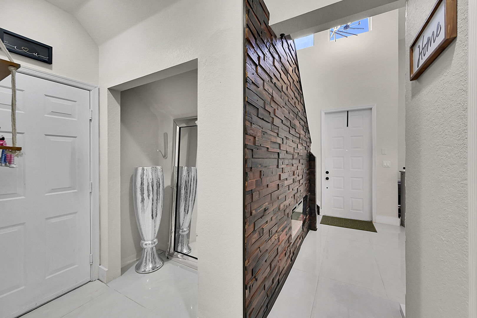 Baseboards Wall, High Ceiling, Textured Wall, Tile Floor, Tile Floor, Vaulted Ceiling