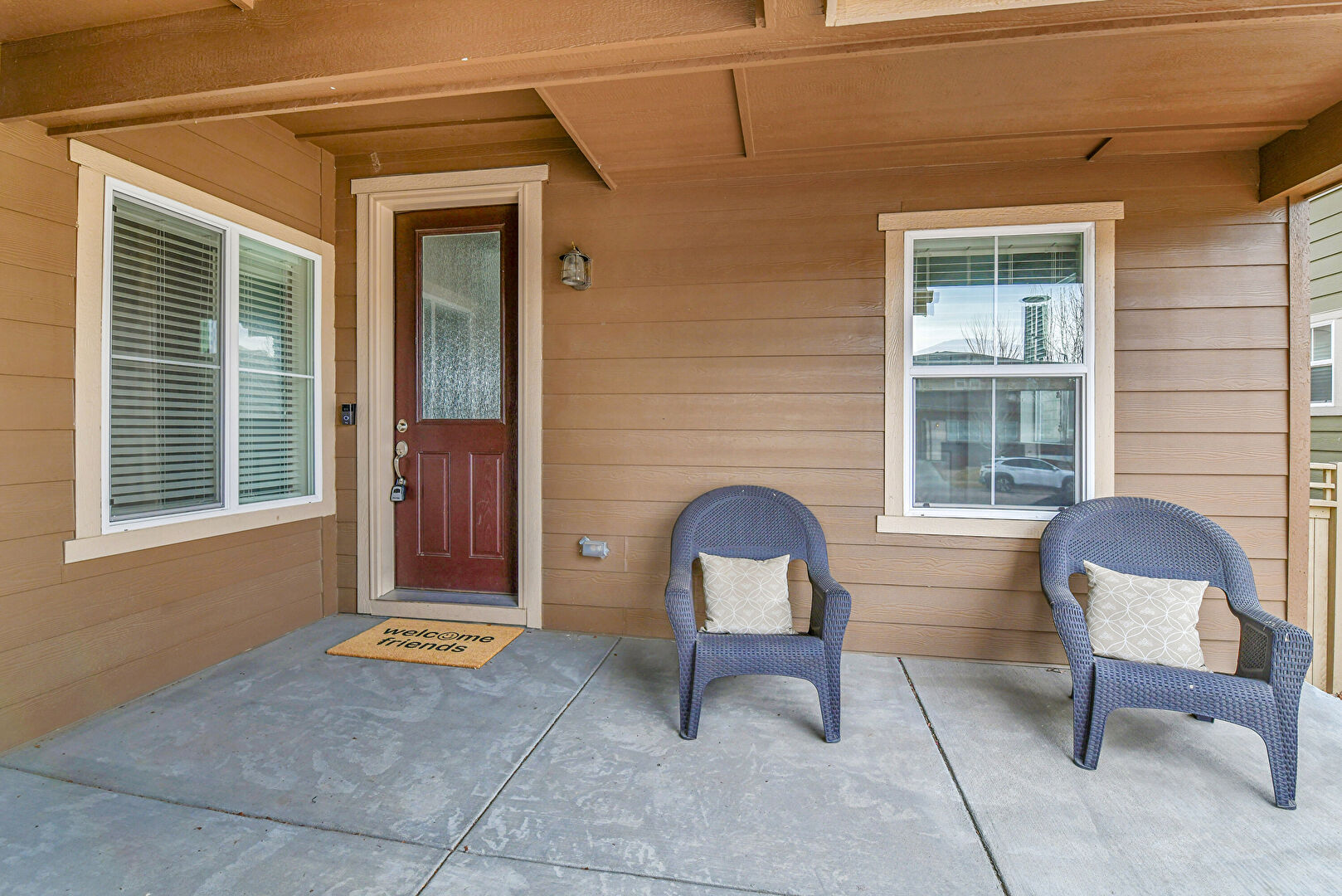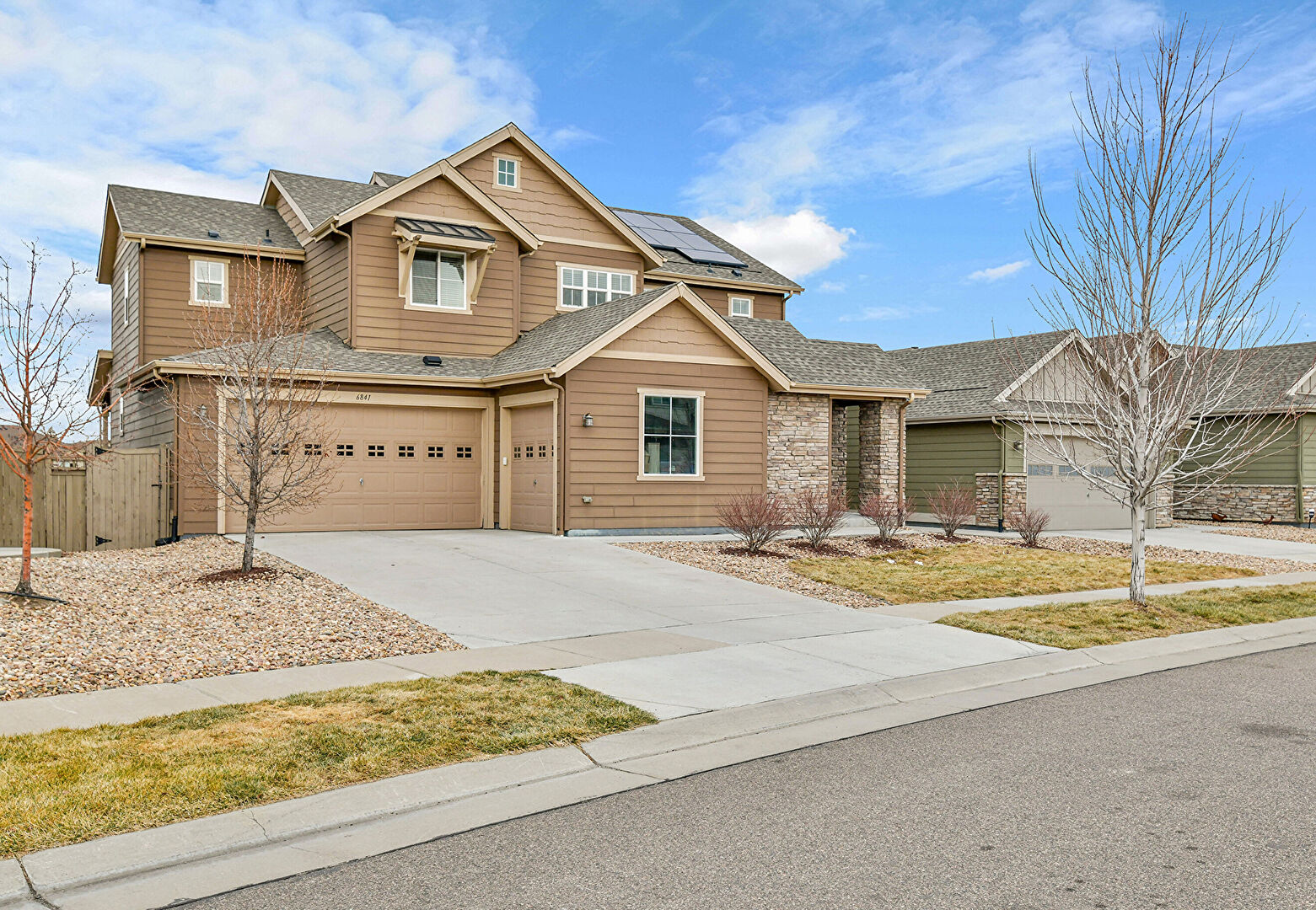 Awning, Built In Garage, Concrete Foundation, Downspout, Driveway, Fence, Gate, Gutters, Horizontal Siding, Shingle Roof, Solar Panels, Lawn, Solar Panels