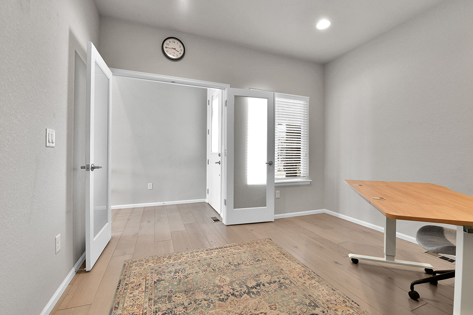 Baseboards Wall, French Doors, Office Area, Recessed Lighting, Textured Wall, Wood Finish Floor, Natural Light
