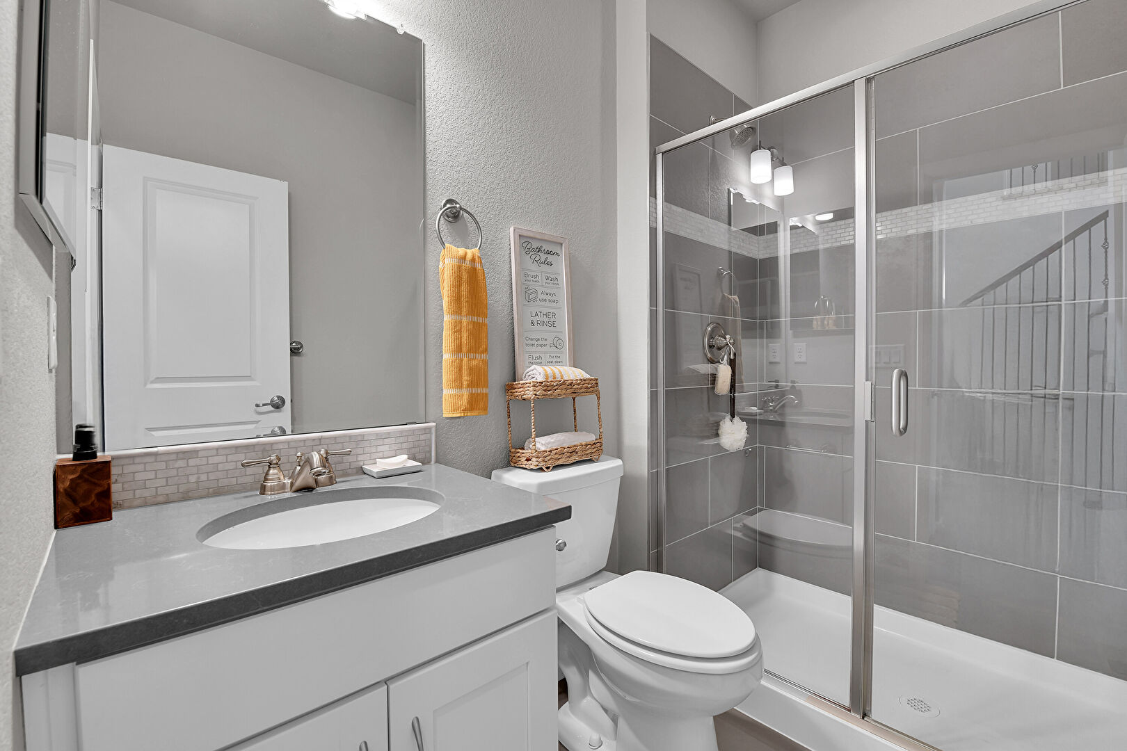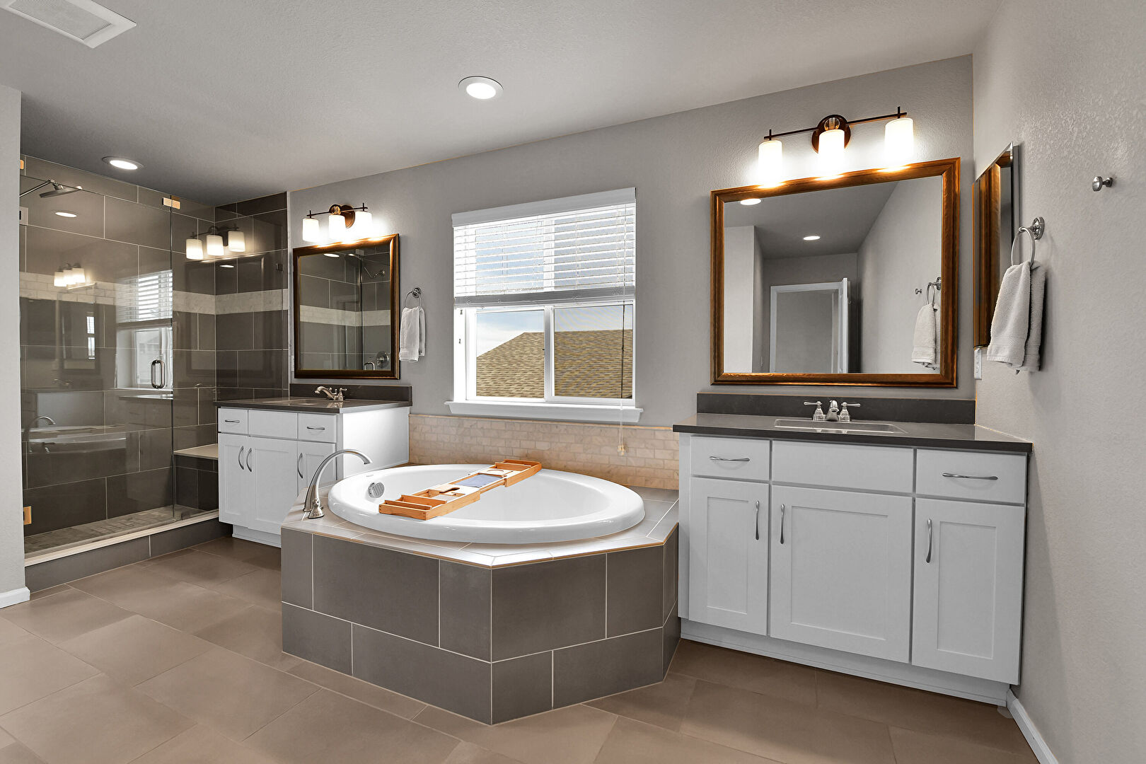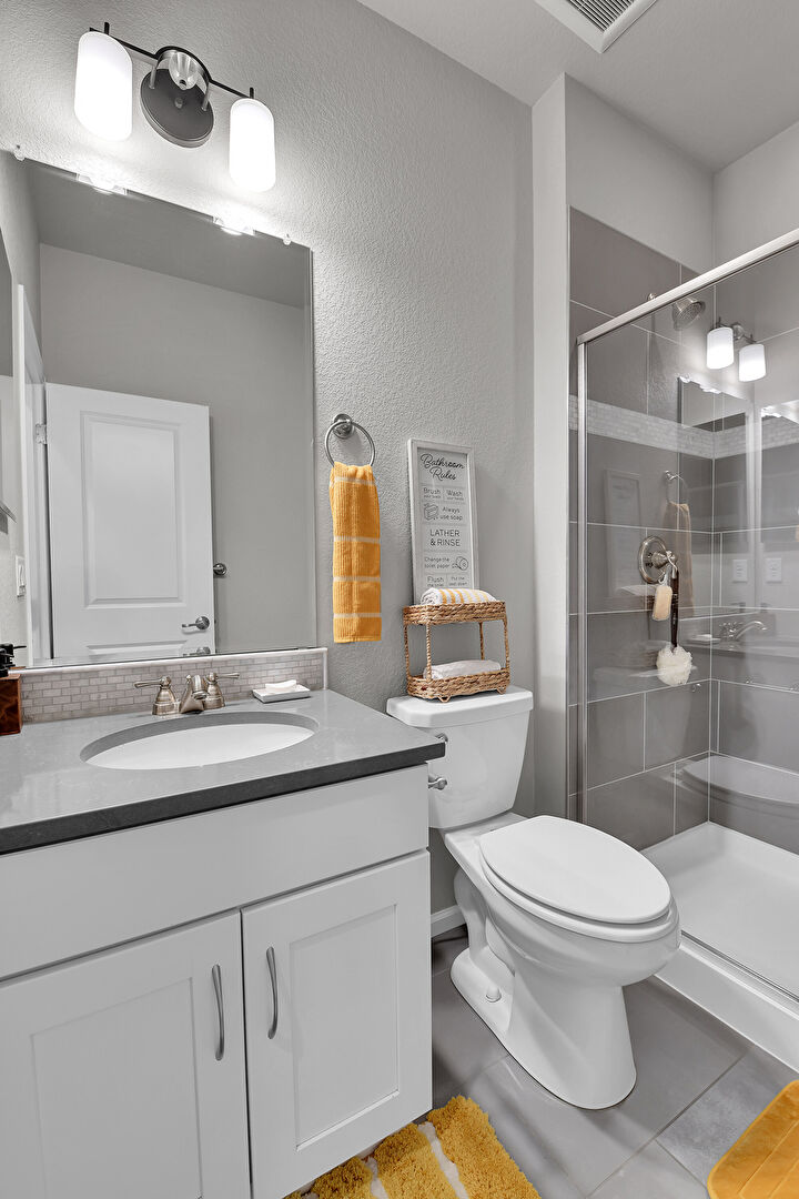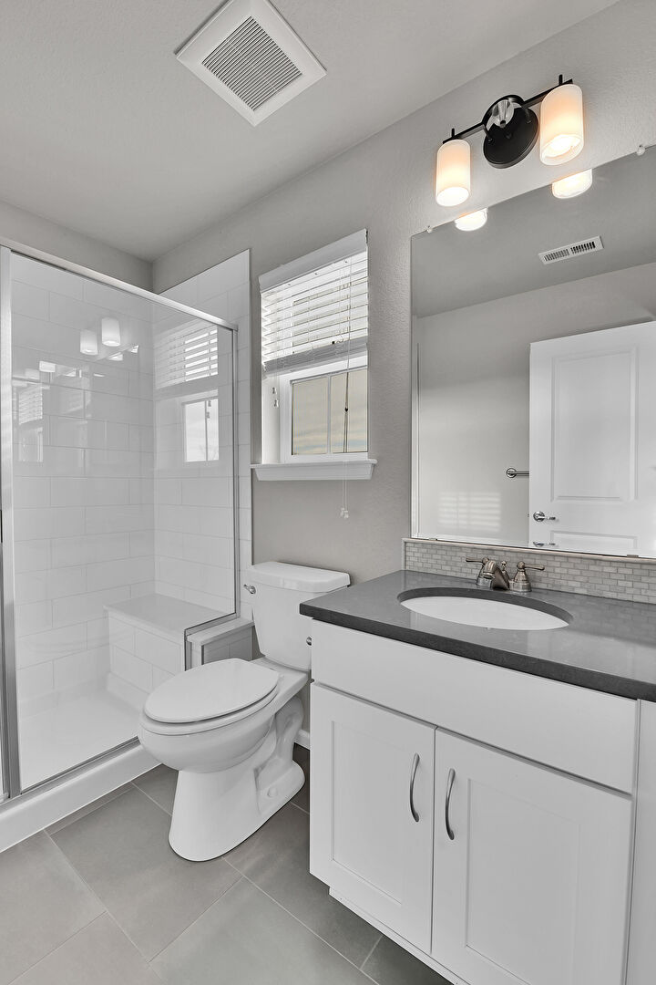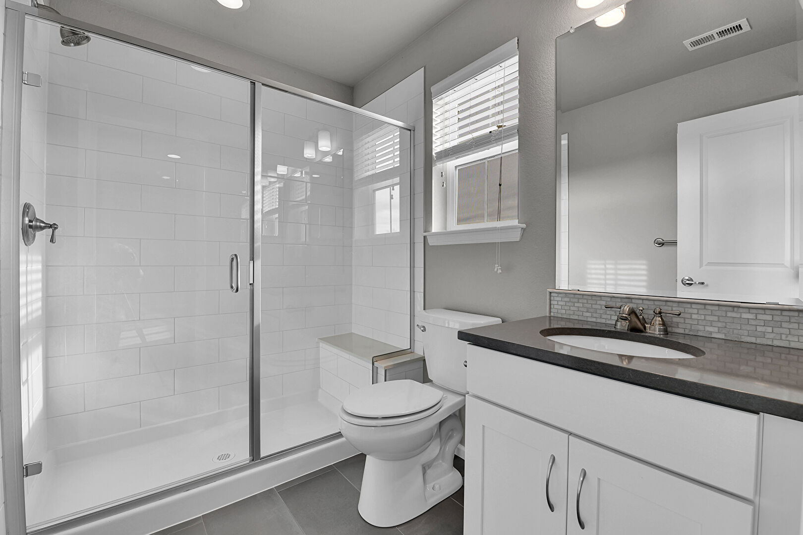 Baseboards Wall, Combined Bath Shower, Double Vanity, Drywall, Full Bathroom, Natural Light, Recessed Lighting, Textured Wall, Tile Floor, Vanity, Vent, Full Bathroom, Textured Wall, Vanity, Vent