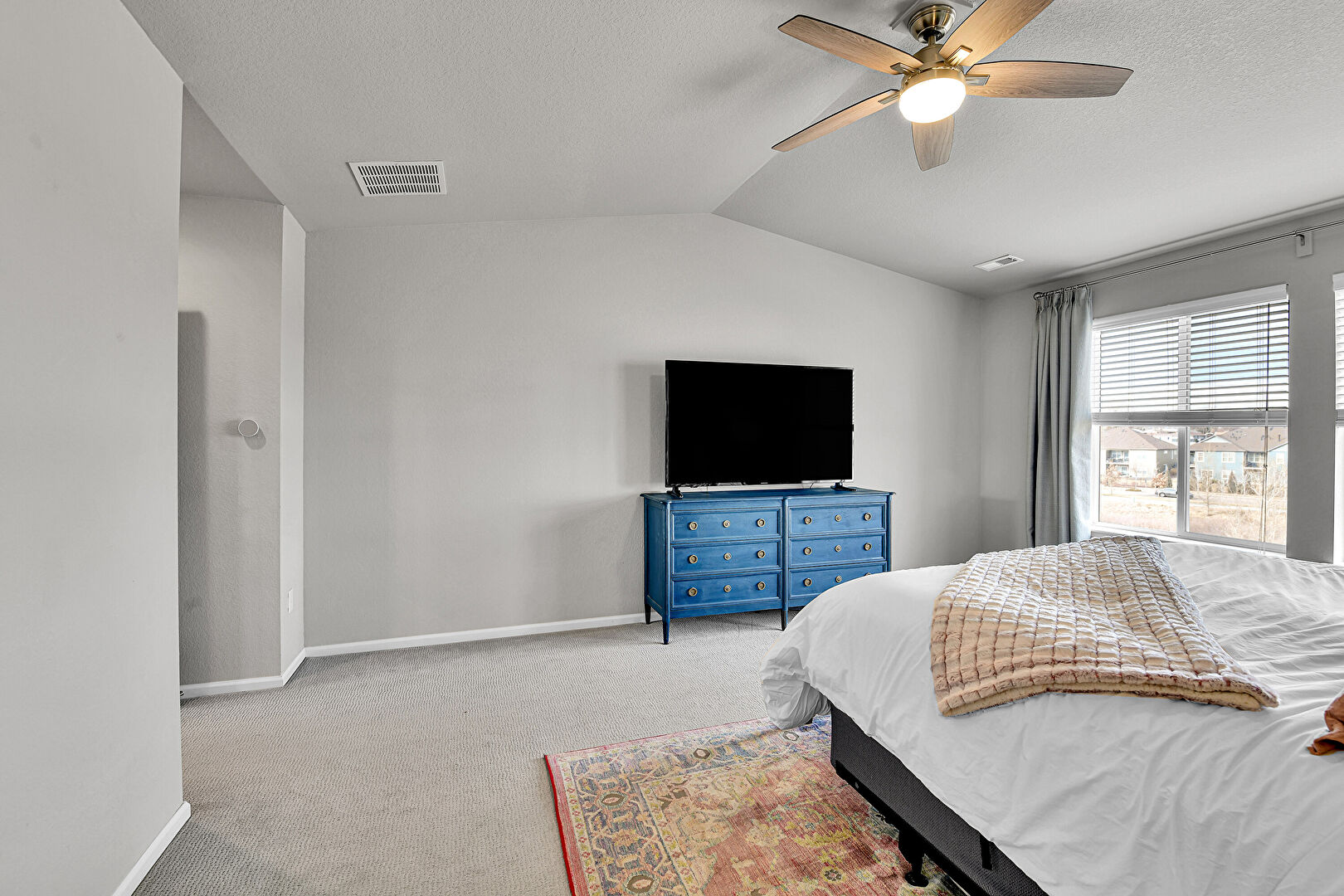 Baseboards Wall, Carpet, Cathedral Ceiling, Ceiling Fan, Drywall, Ensuite Bathroom, Natural Light, Textured Ceiling, Vaulted Ceiling, Vent, Cathedral Ceiling, Drywall