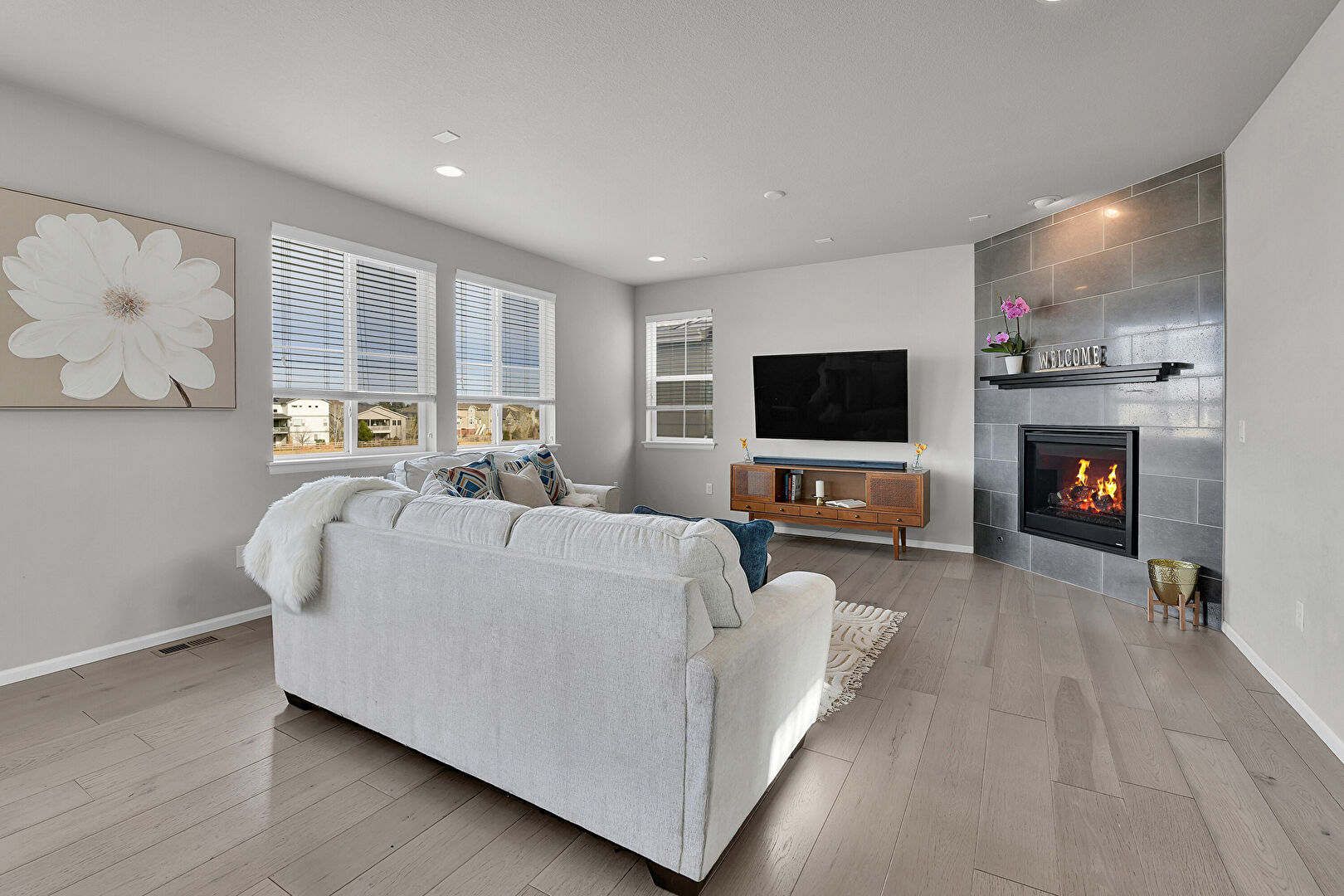 Baseboards Wall, Drywall, Fireplace, L Shaped Kitchen, Natural Light, Notable Chandelier, Recessed Lighting, Stairs, Vent, Wood Finish Floor, Baseboards Wall, Natural Light