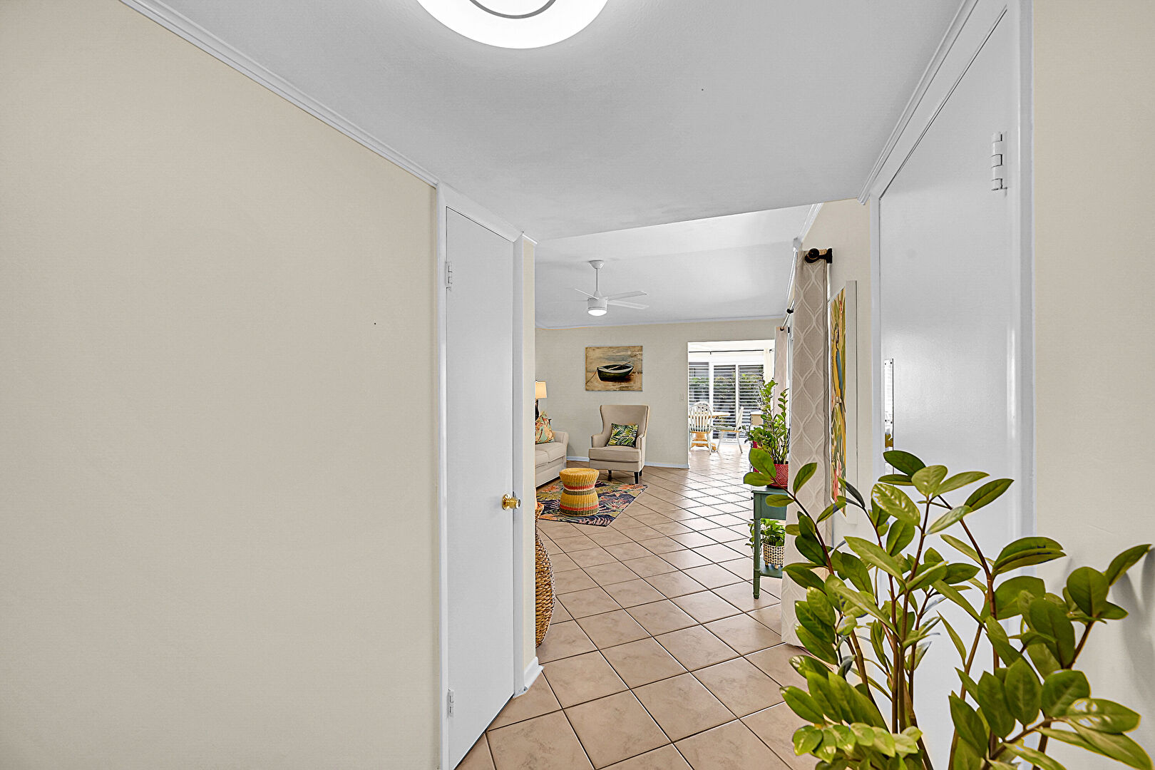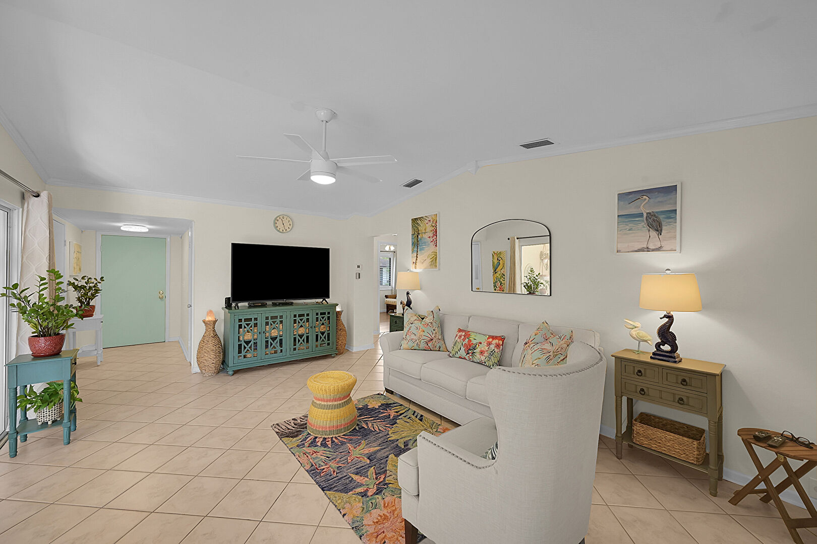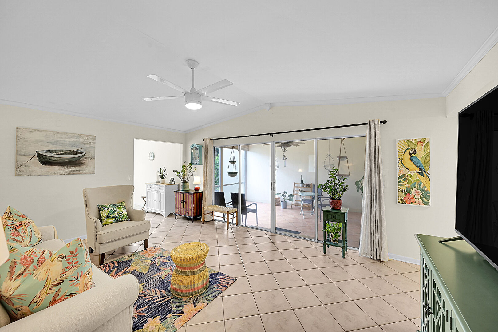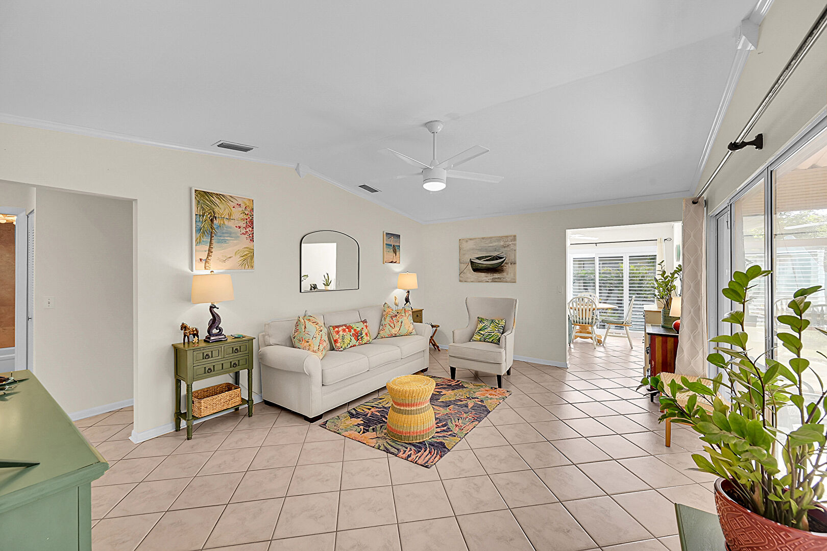 Baseboards Wall, Cathedral Ceiling, Ceiling Fan, Crown Molding, Drywall, Natural Light, Sunroom, Tile Floor, Vaulted Ceiling, Vent, Ceiling Fan, Crown Molding, Tile Floor, Vaulted Ceiling