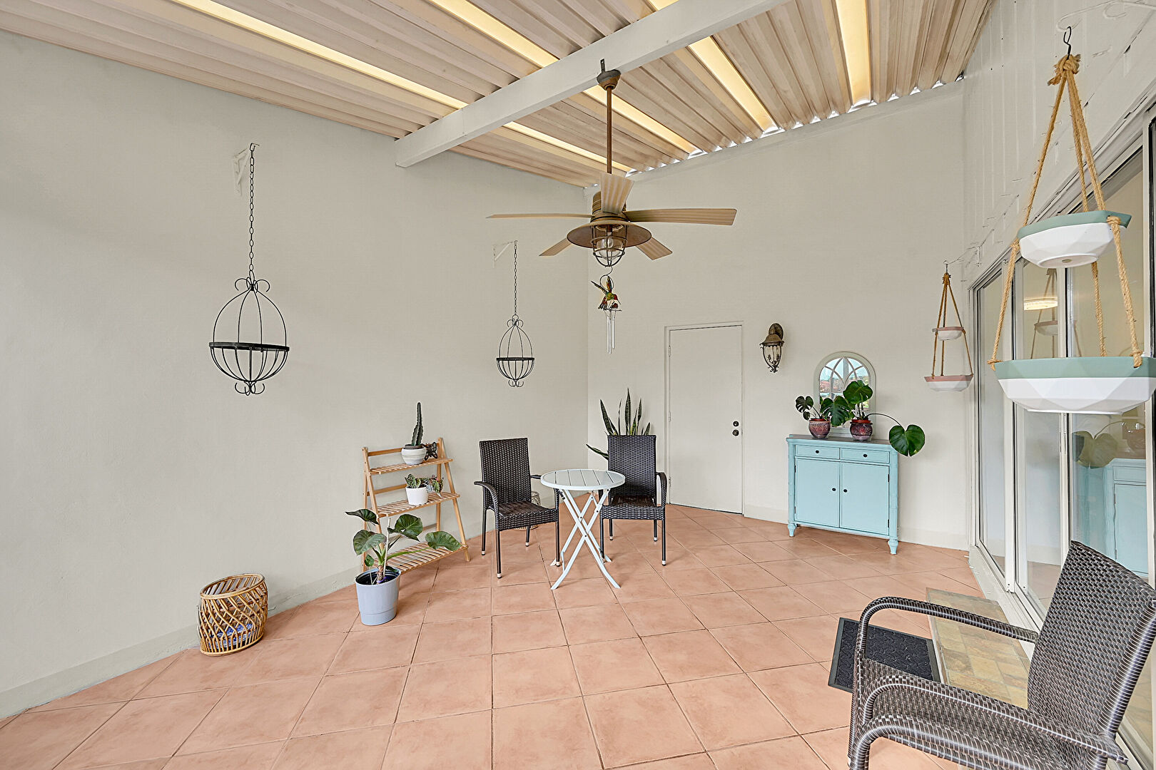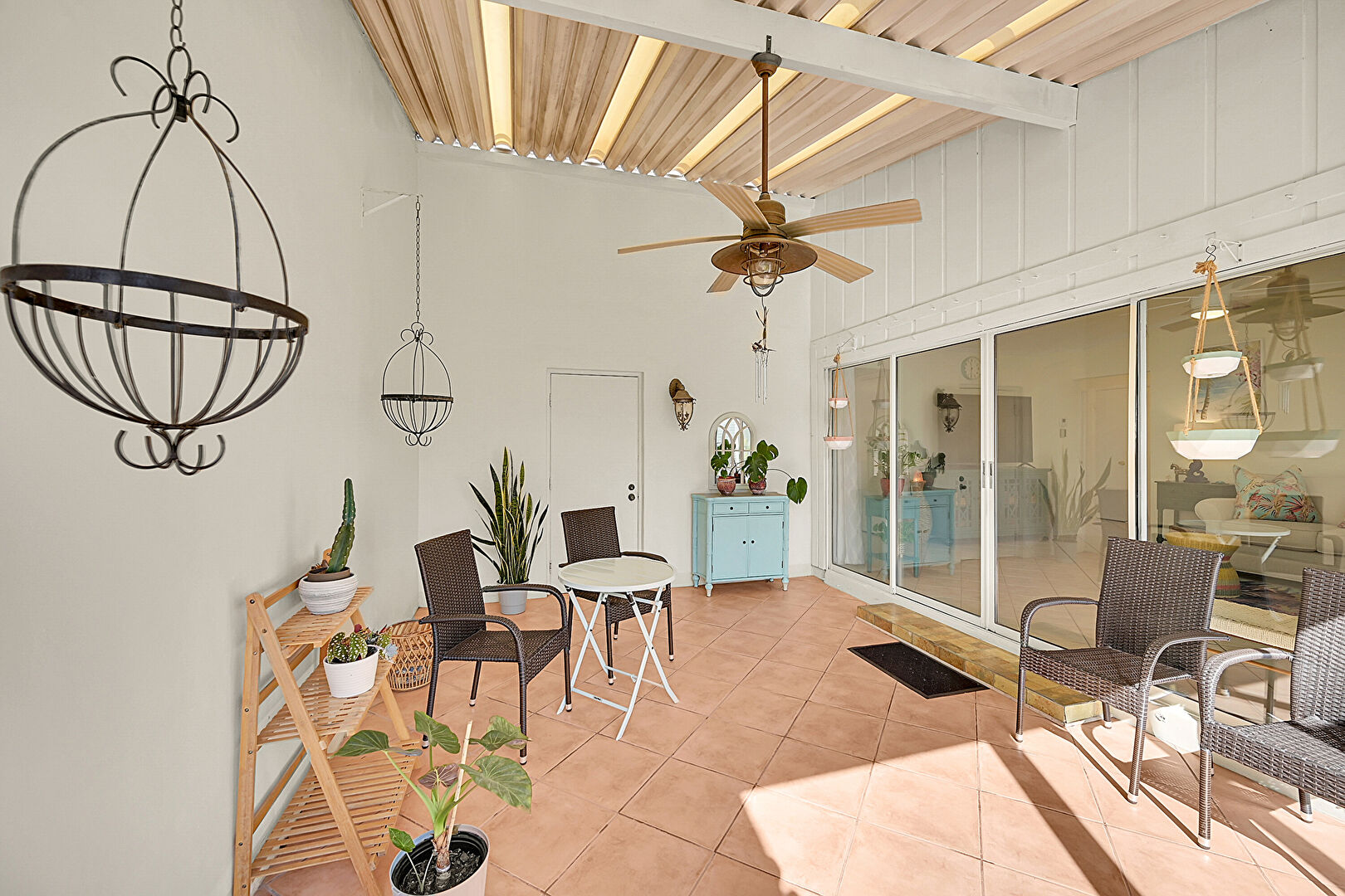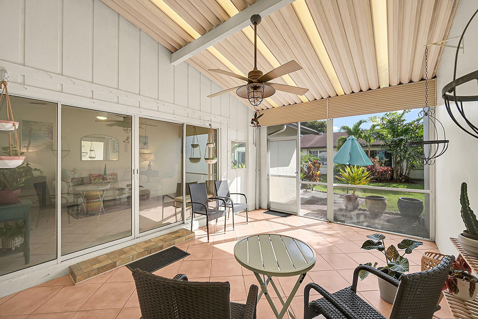 Beamed Ceiling, Ceiling Fan, Natural Light, Patio, Sunroom, Lanai, Outdoor Dining Area, Sunroom