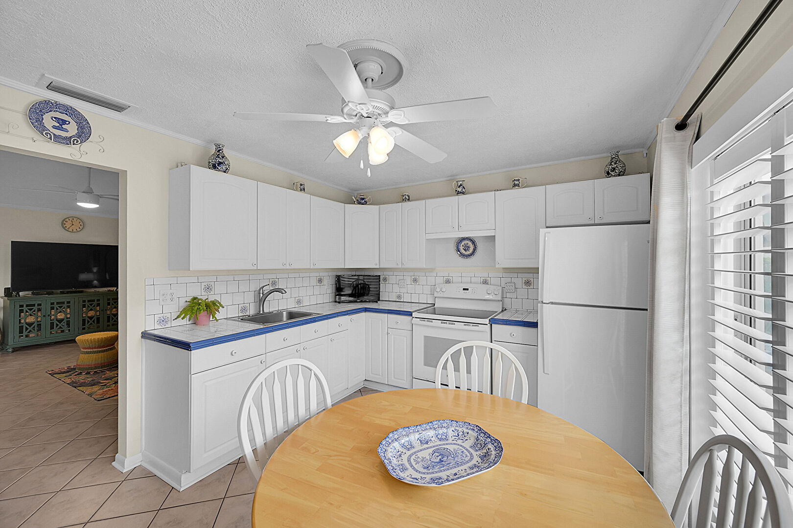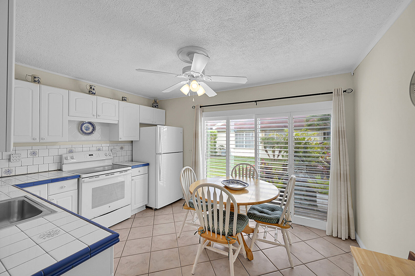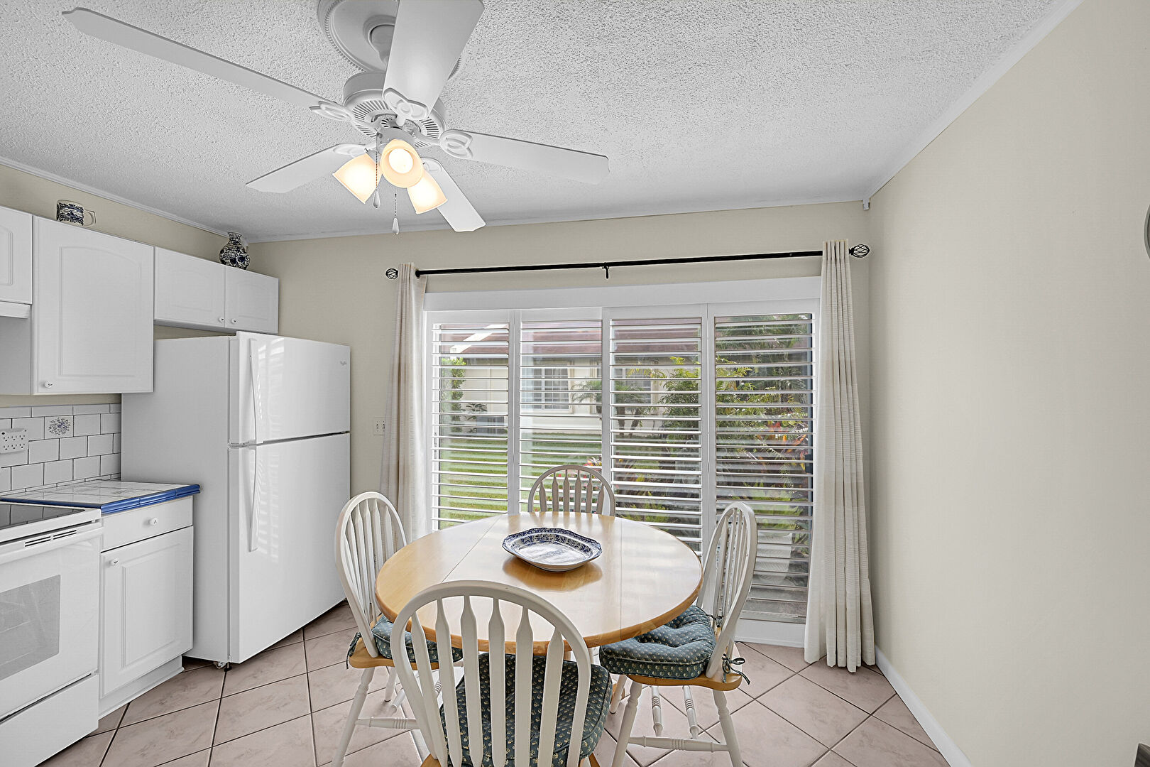 Ceiling Fan, Drywall, Natural Light, Textured Ceiling, Tile Floor, Baseboards Wall