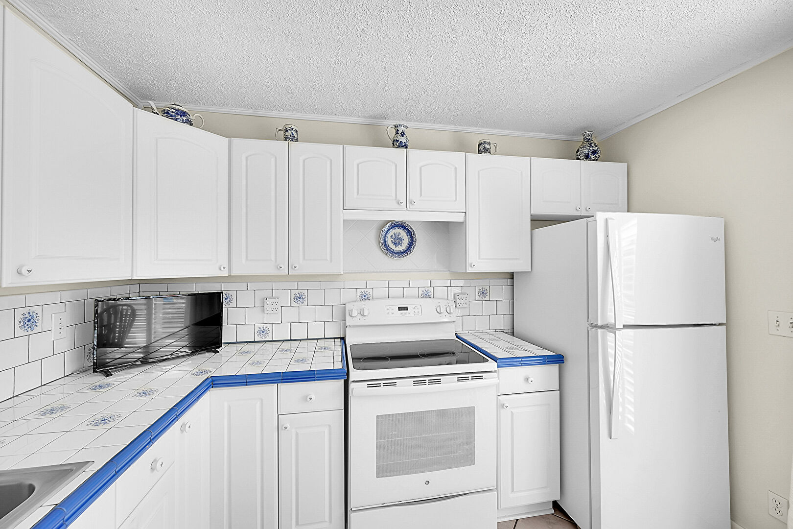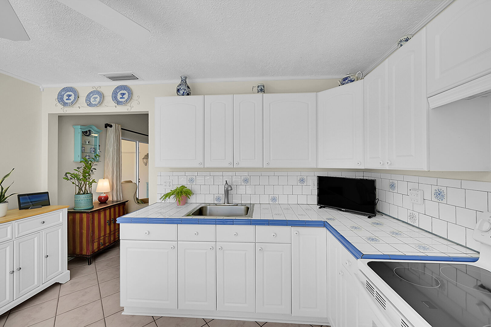 Arched Cabinets, Ceiling Fan, Crown Molding, Drywall, L Shaped Kitchen, Natural Light, Open Shelves, Raised Cabinets, Textured Ceiling, Tile Countertops, Tile Floor, Vent, Drywall, Natural Light, Textured Ceiling, Tile Countertops