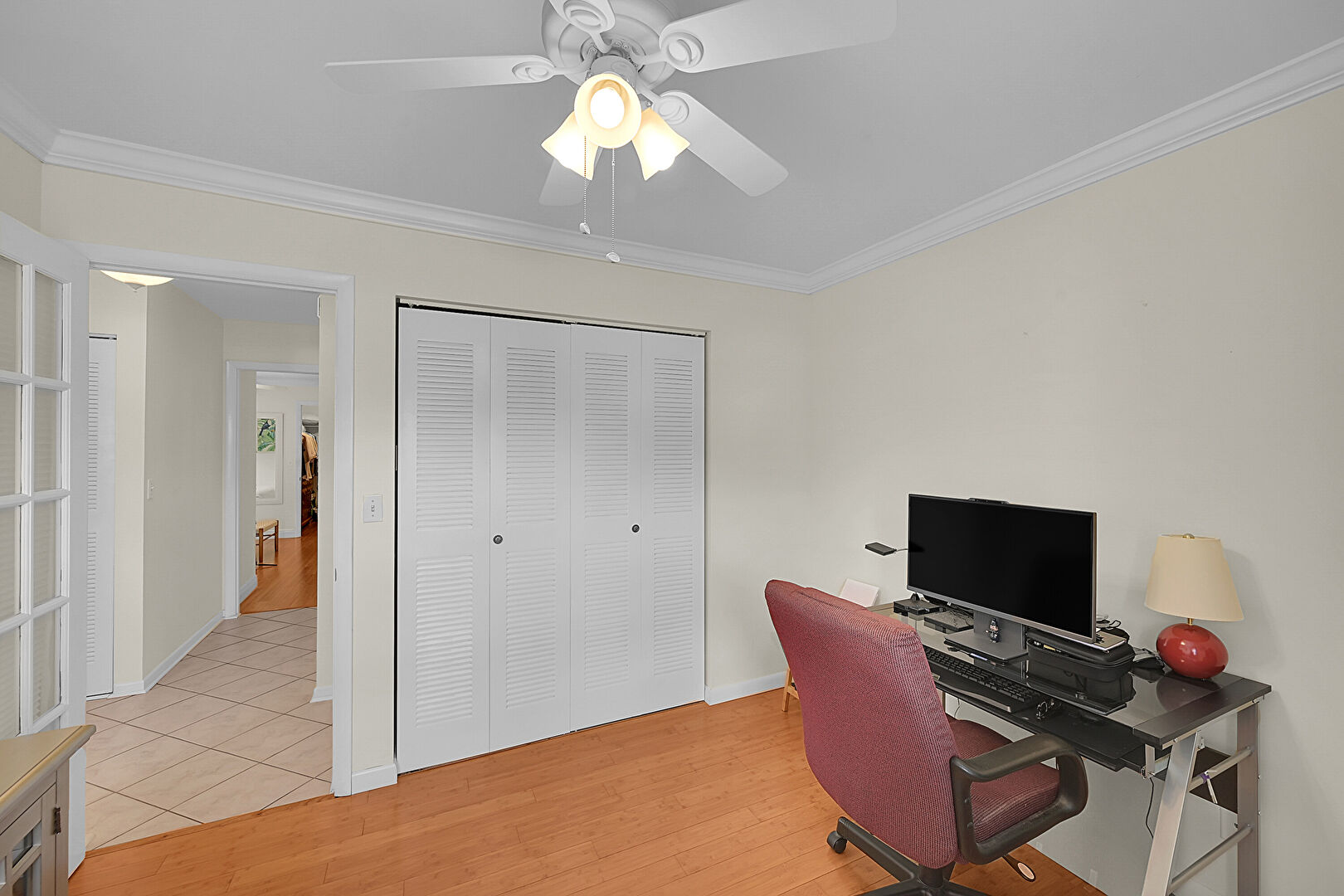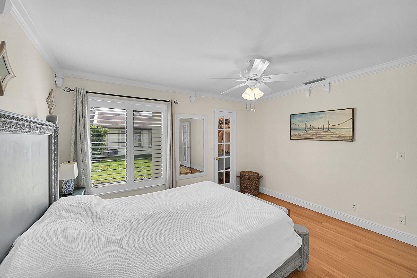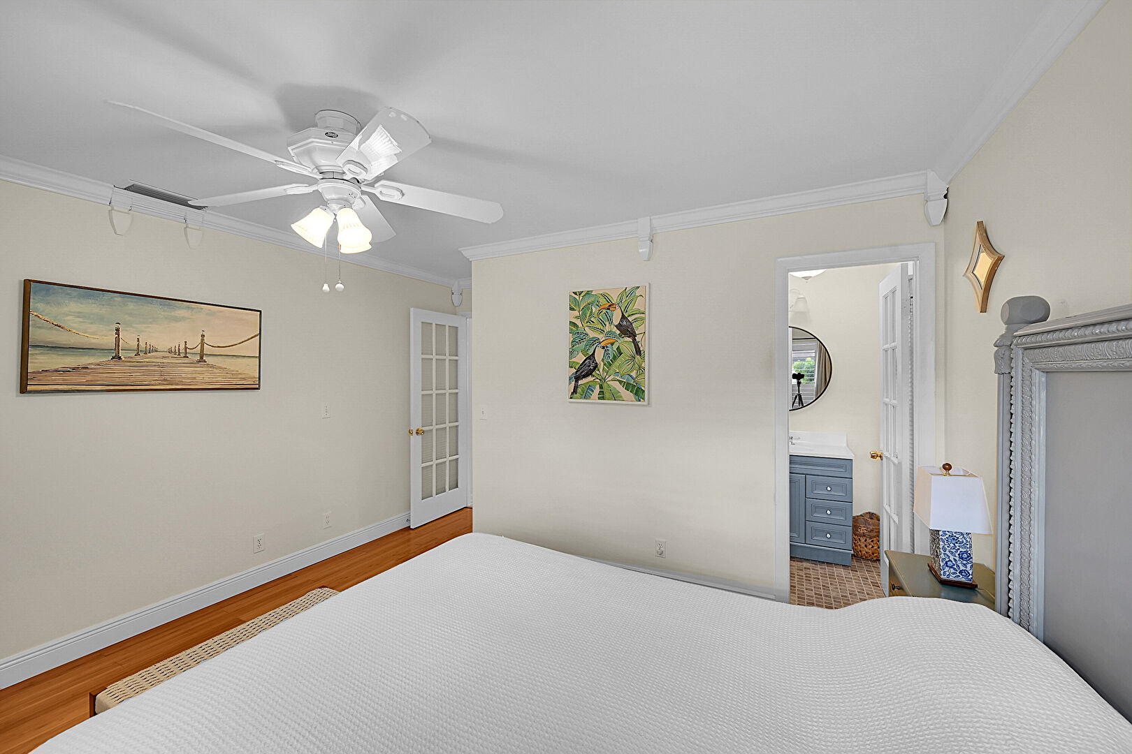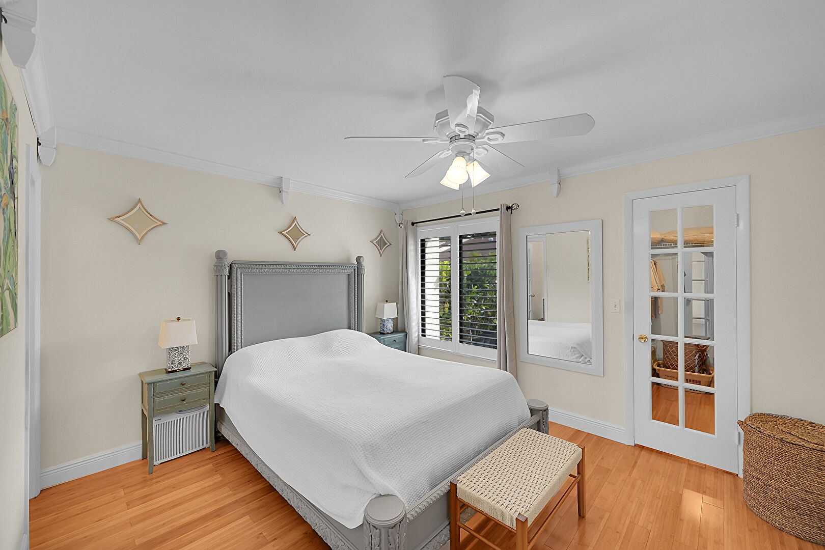 Baseboards Wall, Ceiling Fan, Crown Molding, Drywall, Natural Light, Vent, Wood Finish Floor, Crown Molding, French Doors