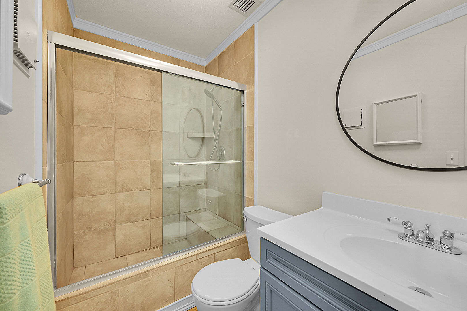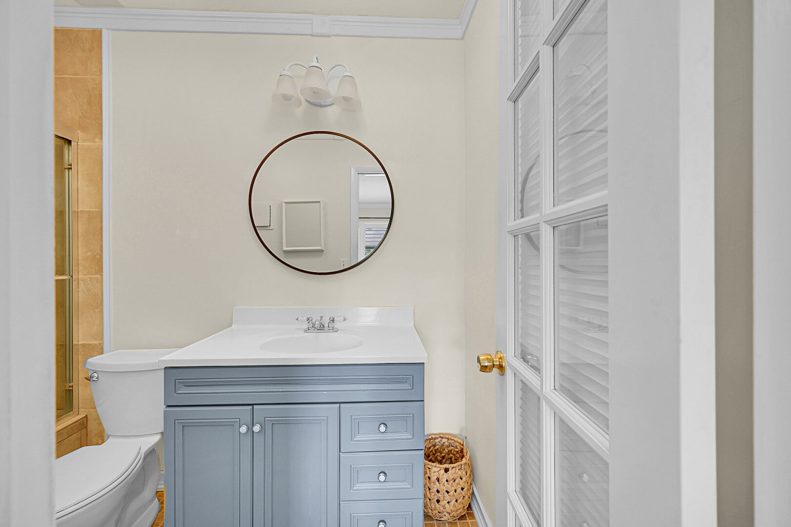 Combined Bath Shower, Crown Molding, Drywall, Full Bathroom, Vanity