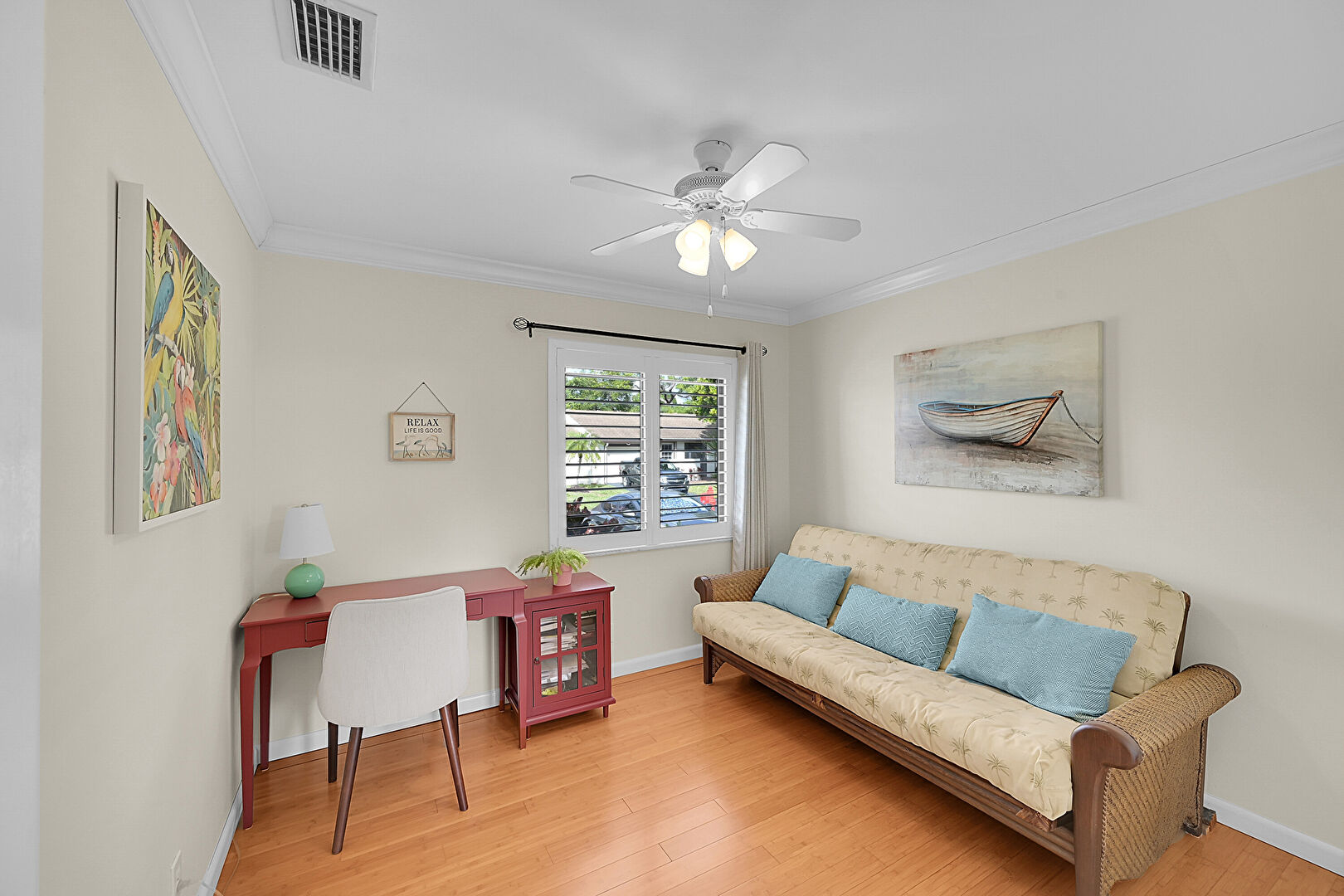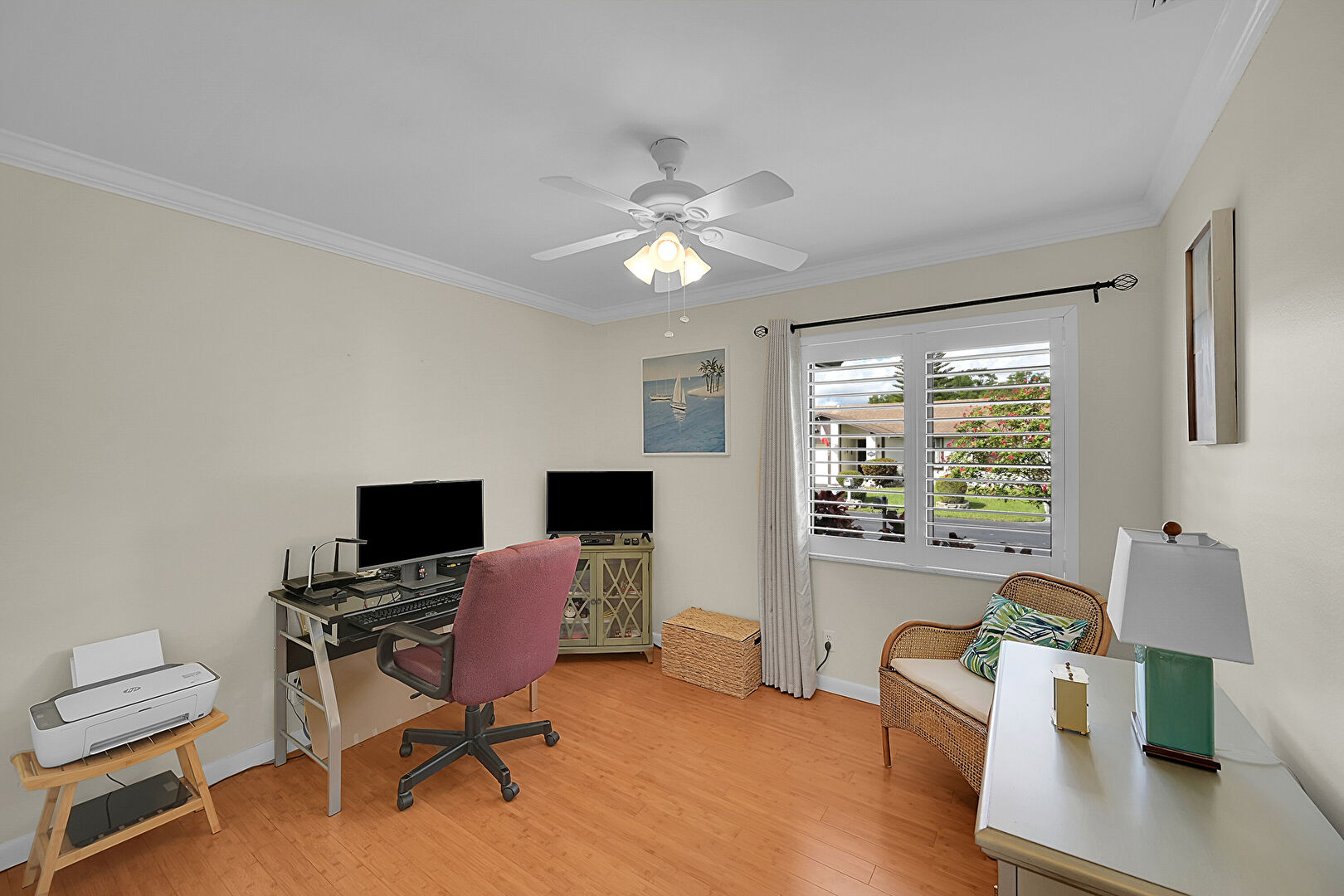 Baseboards Wall, Ceiling Fan, Crown Molding, Drywall, Natural Light, Office Area, Wood Finish Floor, Drywall, Office Area
