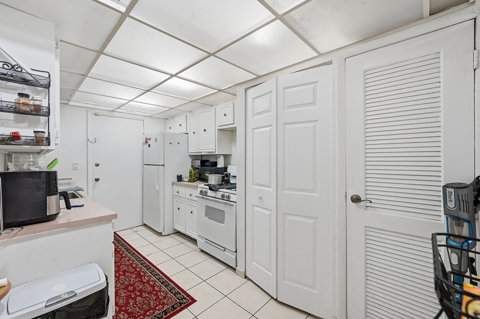 Drop Ceiling, Drywall, Galley Kitchen, Natural Light, Open Shelves, Shaker Cabinets, Tile Floor, Vent, Visible Hinge Cabinets, Drop Ceiling, Shaker Cabinets, Tile Floor