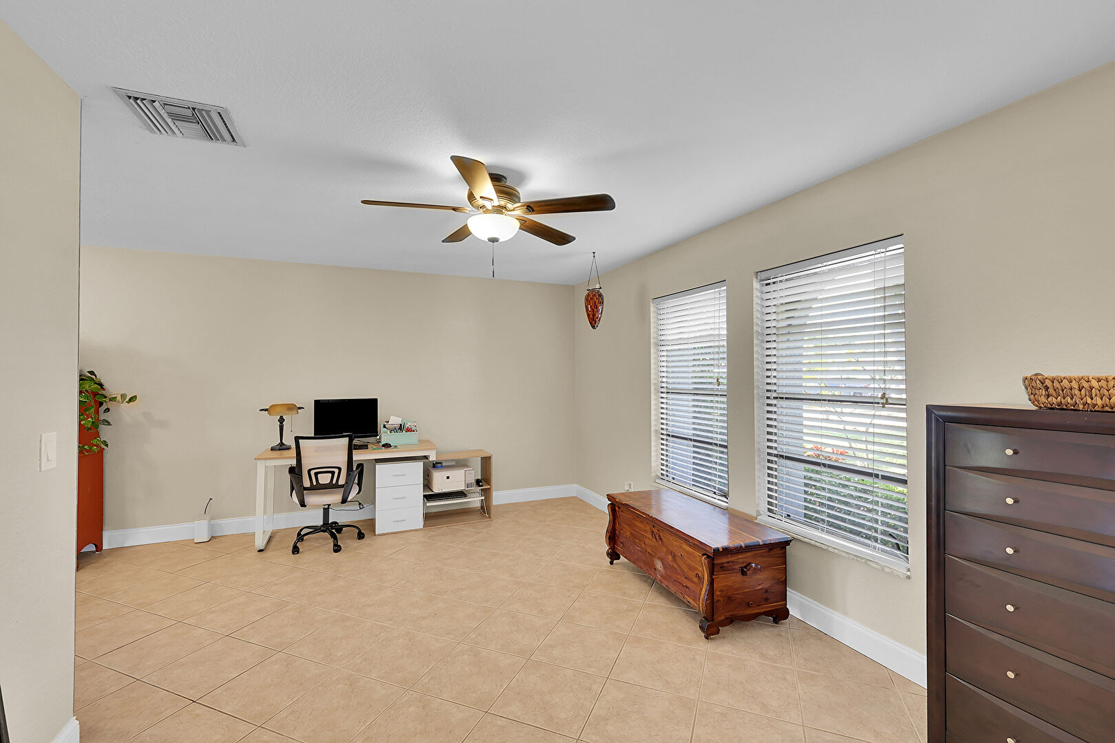 Baseboards Wall, Ceiling Fan, Crown Molding Cabinets, Drywall, Kitchen Bar, Natural Light, Office Area, Pendant Lighting, Shaker Cabinets, Stone Countertops, Tile Floor, Vent, Arched Walkways, Vent