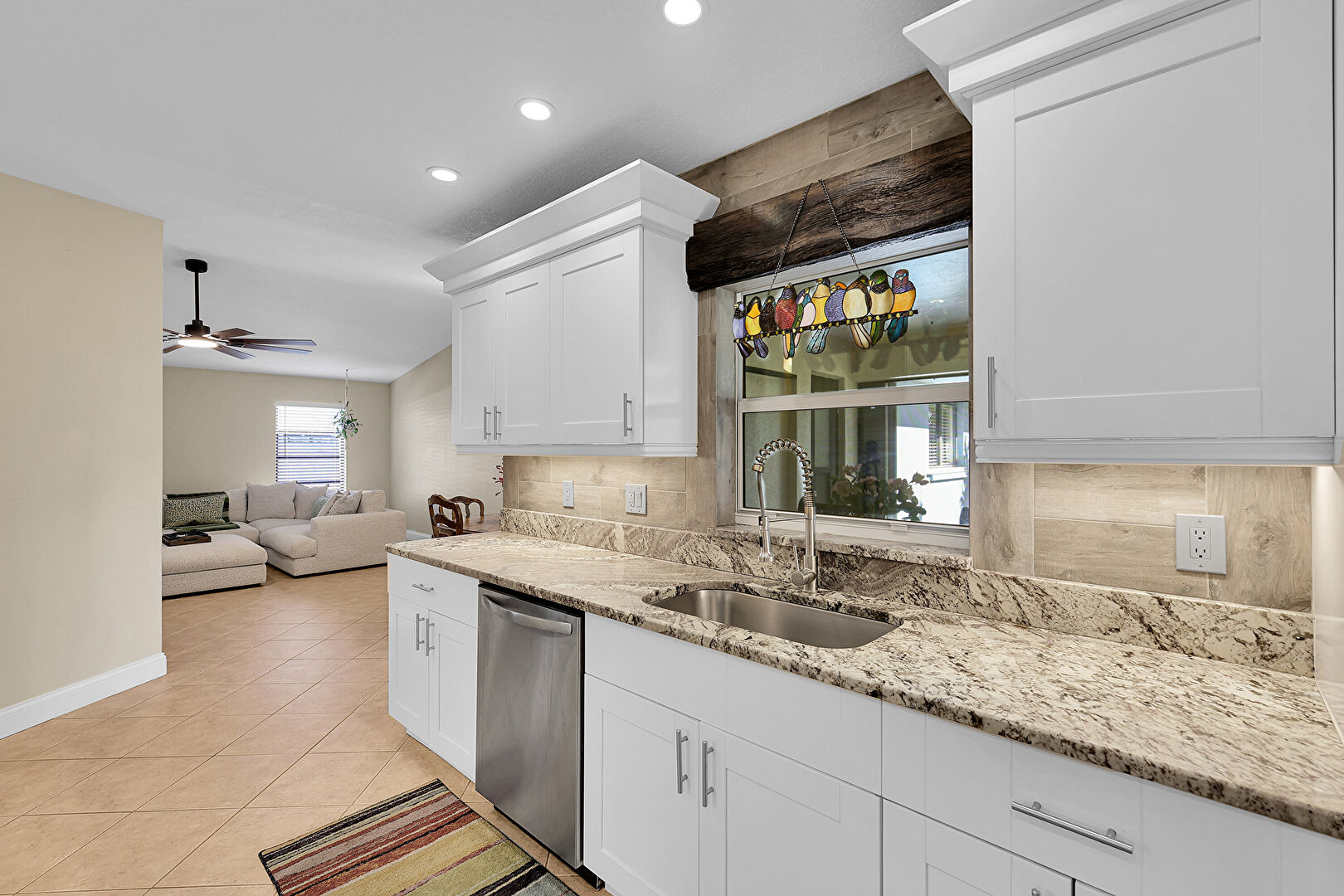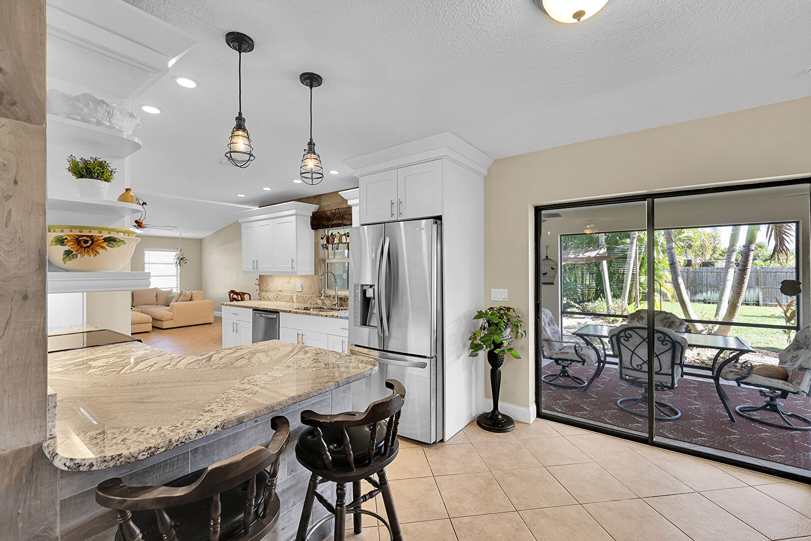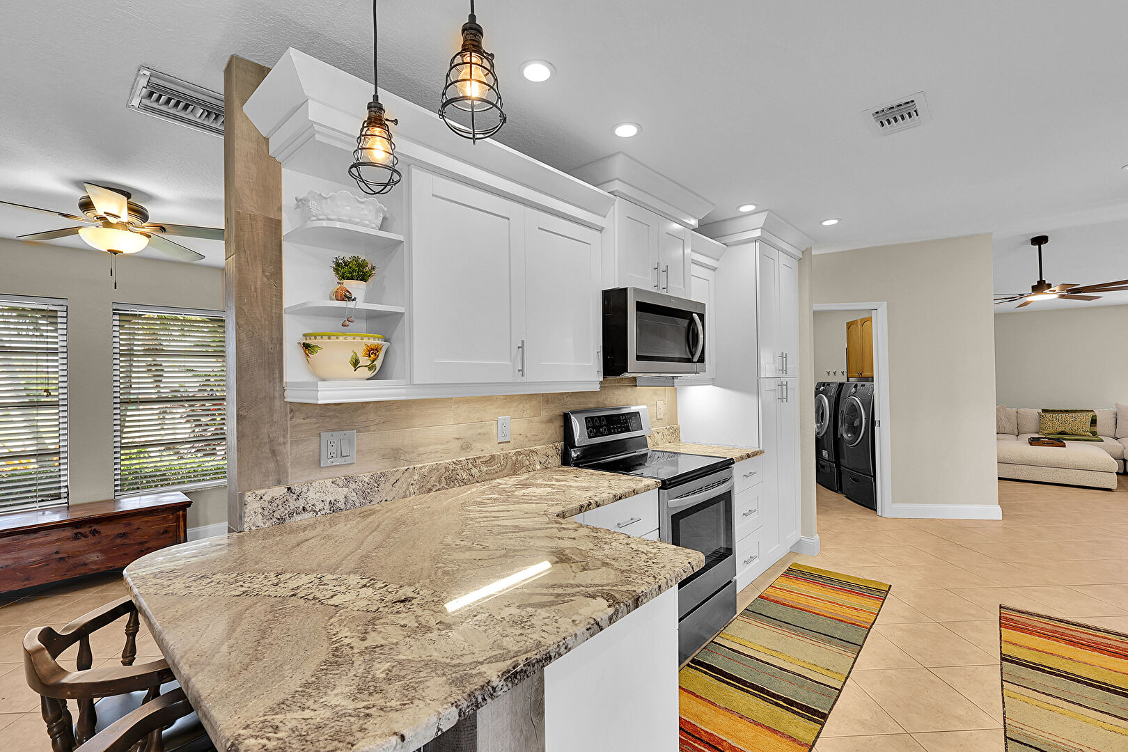 Baseboards Wall, Ceiling Fan, Crown Molding Cabinets, Drywall, Galley Kitchen, Kitchen Bar, Kitchen Peninsula, Laundry, Natural Light, Open Shelves, Opens To Living Area, Pendant Lighting, Recessed Lighting, Shaker Cabinets, Stone Countertops, Tile Floor, Vent, Baseboards Wall, Ceiling Fan, Crown Molding Cabinets, Natural Light, Open Shelves, Textured Ceiling, Tile Floor