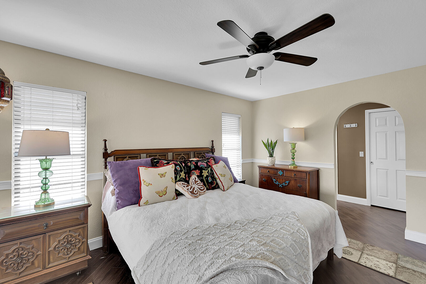 Arched Walkways, Baseboards Wall, Ceiling Fan, Closet, Drywall, Natural Light, Notable Chandelier, Vent, Wood Finish Floor, Access To Exterior, Baseboards Wall, Ceiling Fan, Closet, Natural Light, Textured Ceiling, Wood Finish Floor