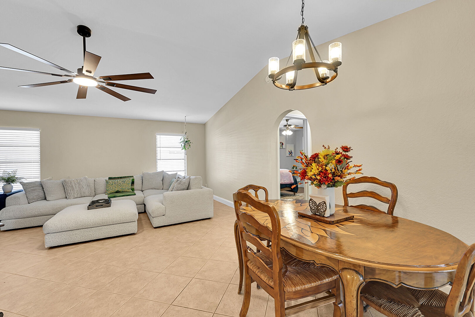 Arched Walkways, Baseboards Wall, Cathedral Ceiling, Ceiling Fan, Drywall, Natural Light, Notable Chandelier, Tile Floor, Vaulted Ceiling