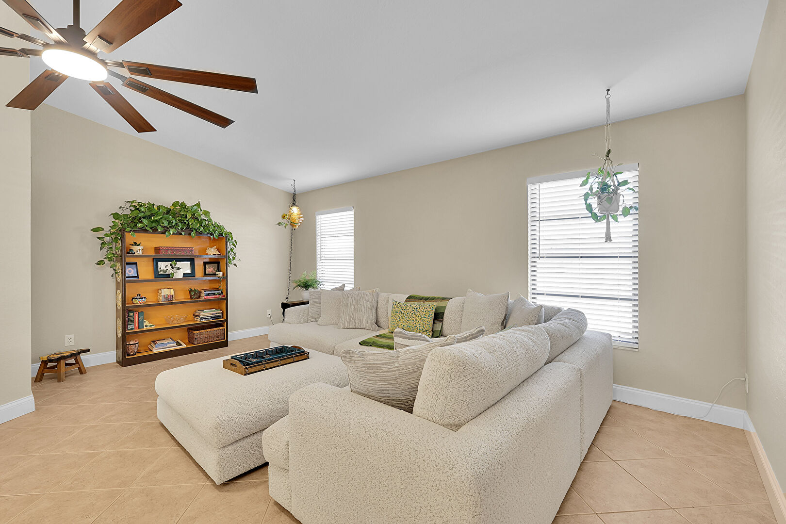 Baseboards Wall, Ceiling Fan, Drywall, Natural Light, Notable Chandelier, Recessed Lighting, Tile Floor, Vaulted Ceiling, Baseboards Wall, Ceiling Fan, Drywall