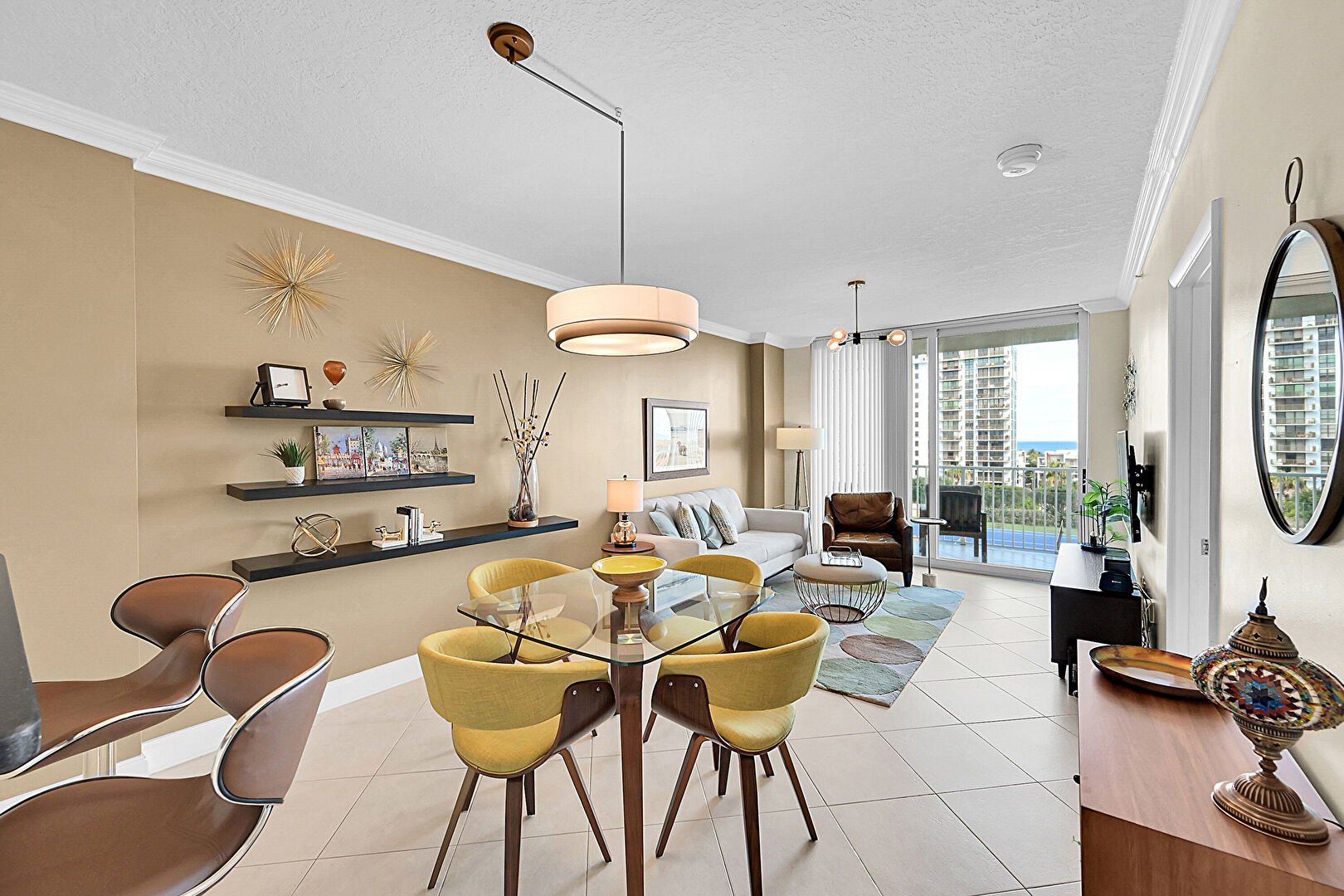 Baseboards Wall, Crown Molding, Drywall, Floor Ceiling Windows, Textured Ceiling, Tile Floor, Natural Light