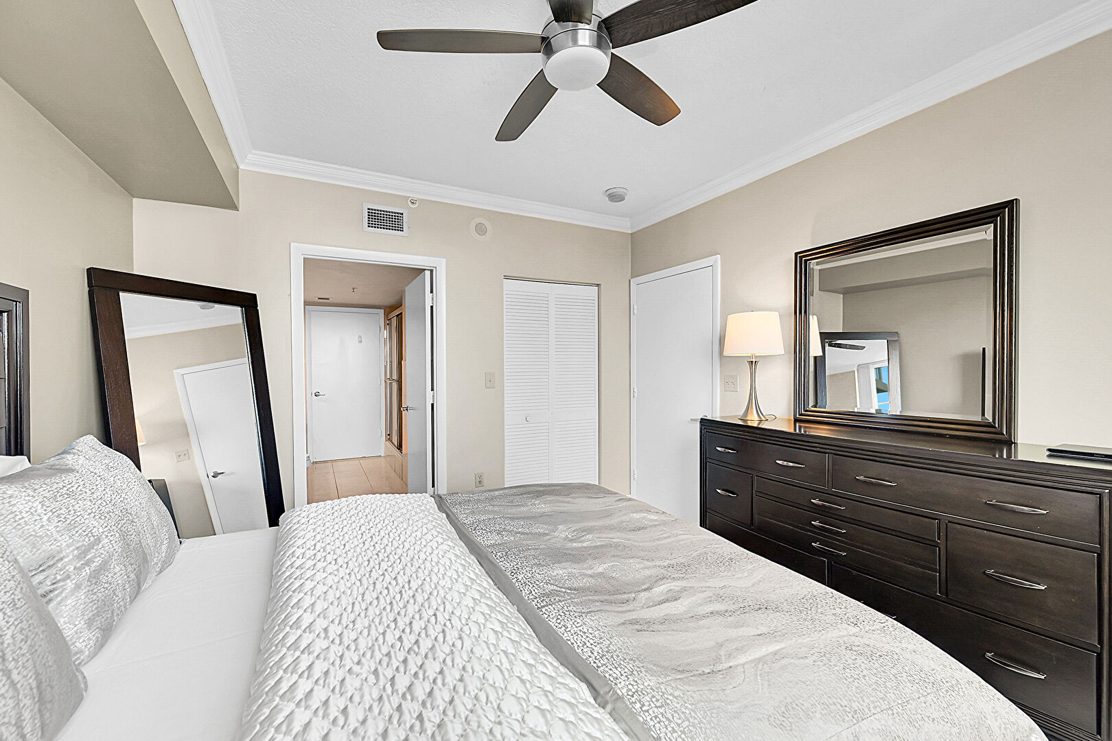 Baseboards Wall, Ceiling Fan, Closet, Crown Molding, Drywall, Ensuite Bathroom, Natural Light, Textured Ceiling, Tile Floor, Vent, Crown Molding, Natural Light, Textured Ceiling, Tile Floor