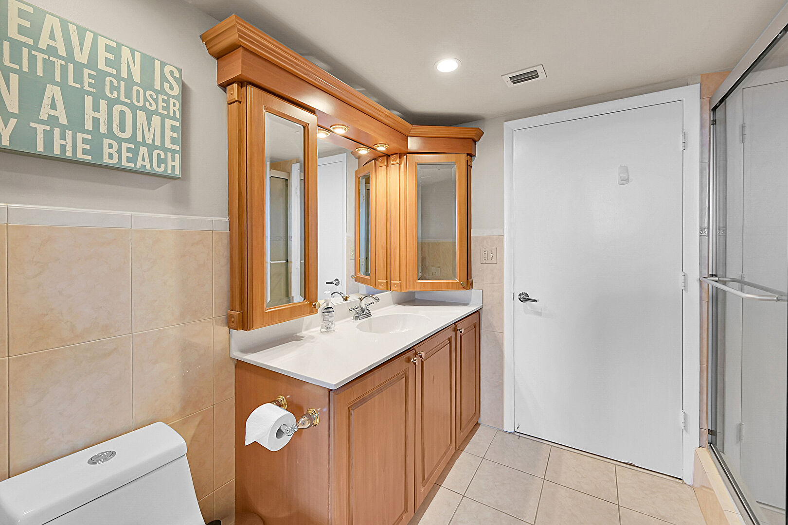 Baseboard Radiator, Closet, Drywall, Full Bathroom, Recessed Lighting, Tile Floor, Tile Wall, Vanity, Vent, Wainscot Wall, Full Bathroom, Tile Wall, Wainscot Wall