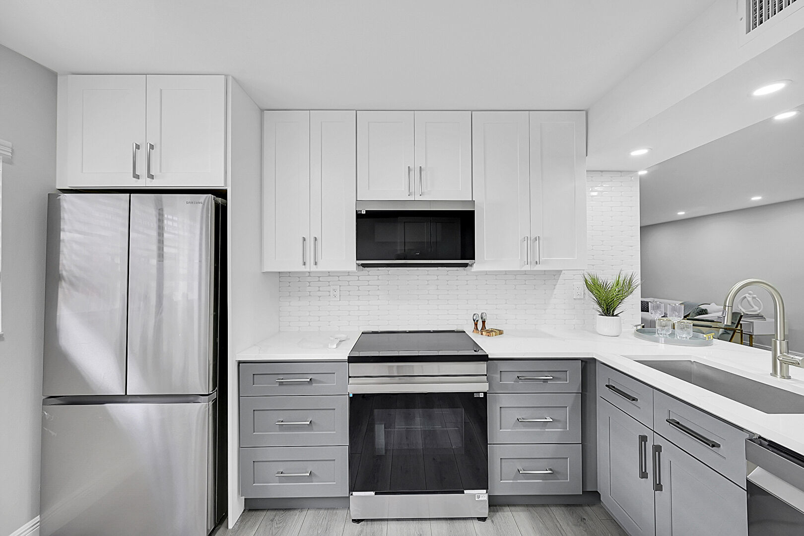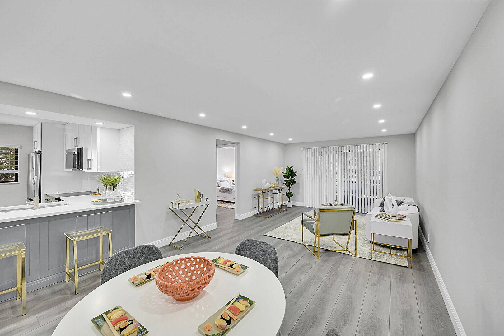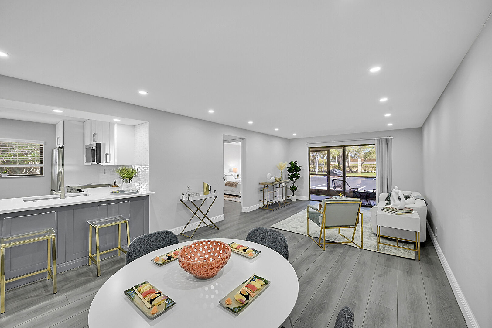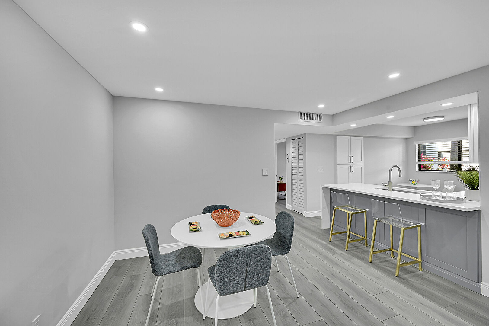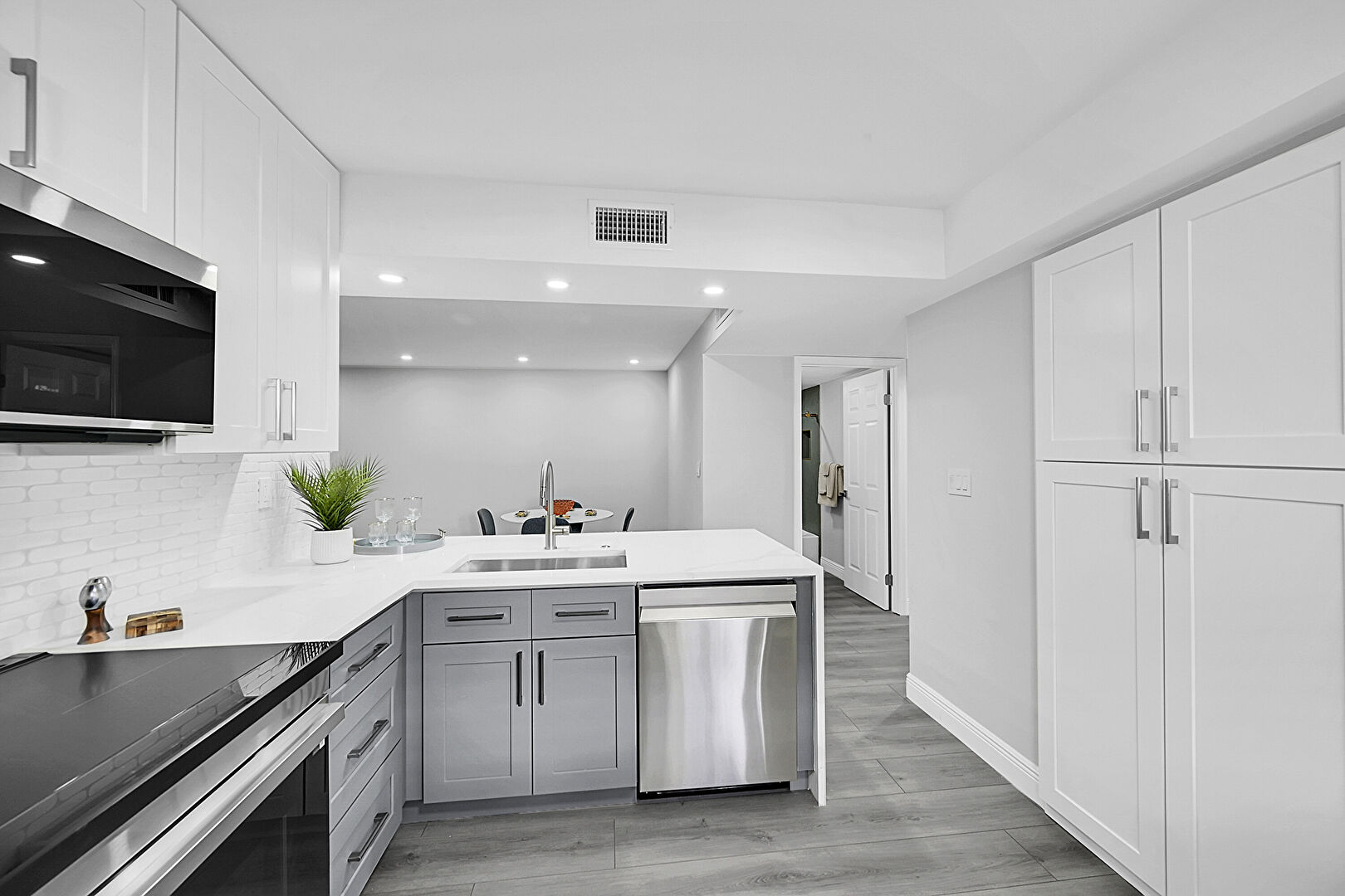 Baseboards Wall, Drywall, Gray Cabinets, Kitchen Bar, Kitchen Peninsula, Natural Light, Recessed Lighting, Shaker Cabinets, Stone Countertops, U Shaped Kitchen, Vent, Wood Finish Floor, Kitchen Bar, Stone Countertops, Vent, Wood Finish Floor