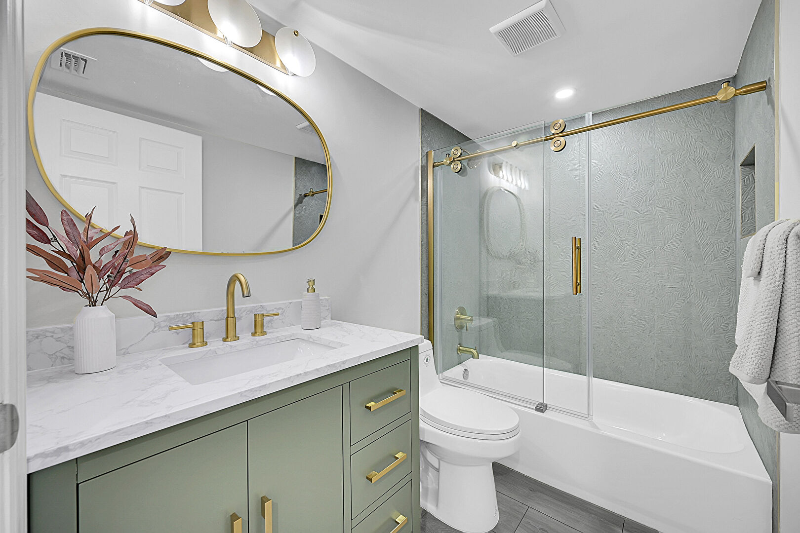Combined Bath Shower, Drywall, Full Bathroom, Vanity, Vent, Wood Finish Floor, Recessed Lighting