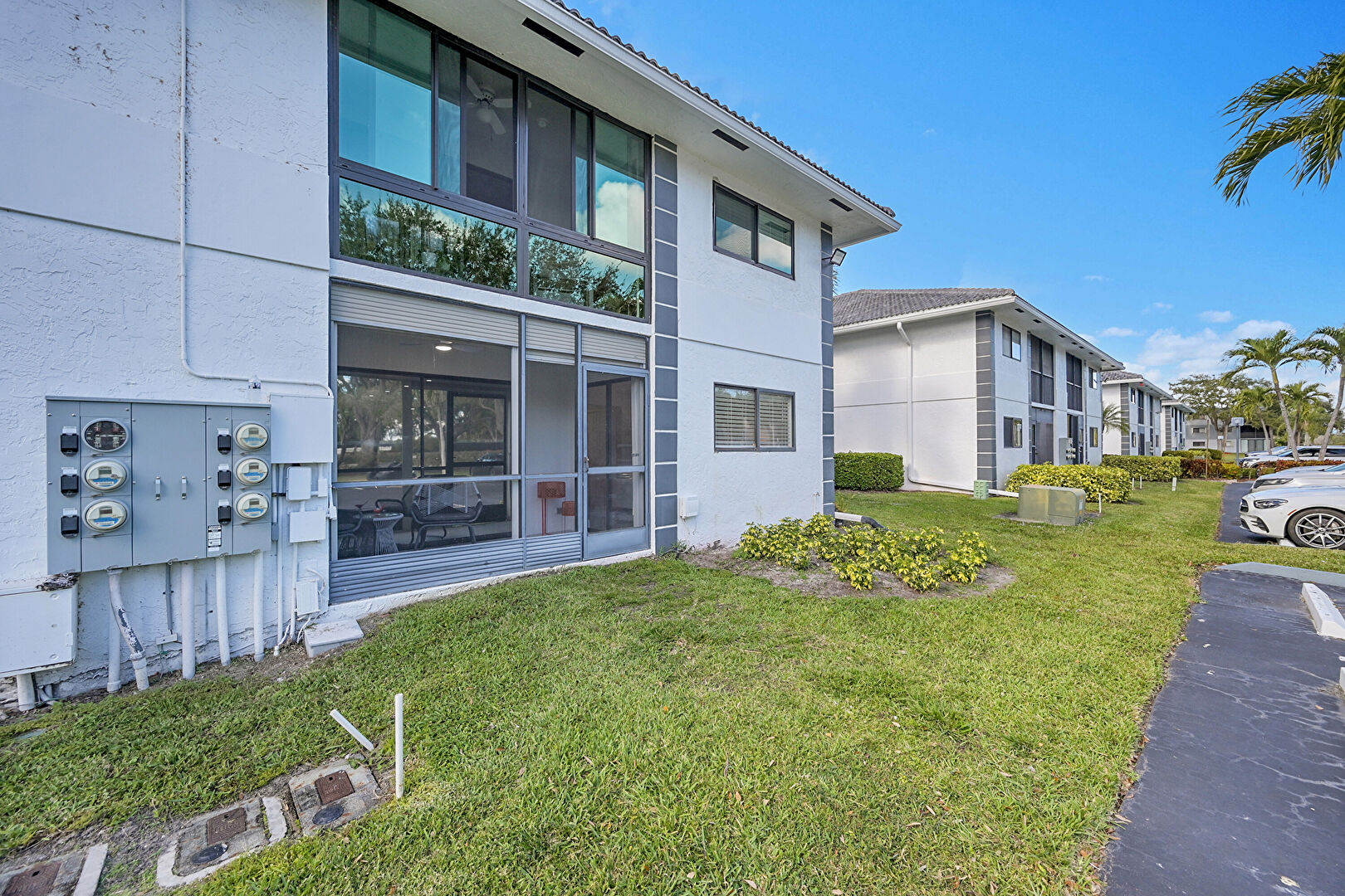 Apartment Complex View, Balcony, Electric Meter, Lawn, Parking Lot, Stucco Siding, Sunroom, Apartment Complex View, Electric Meter, Residential View