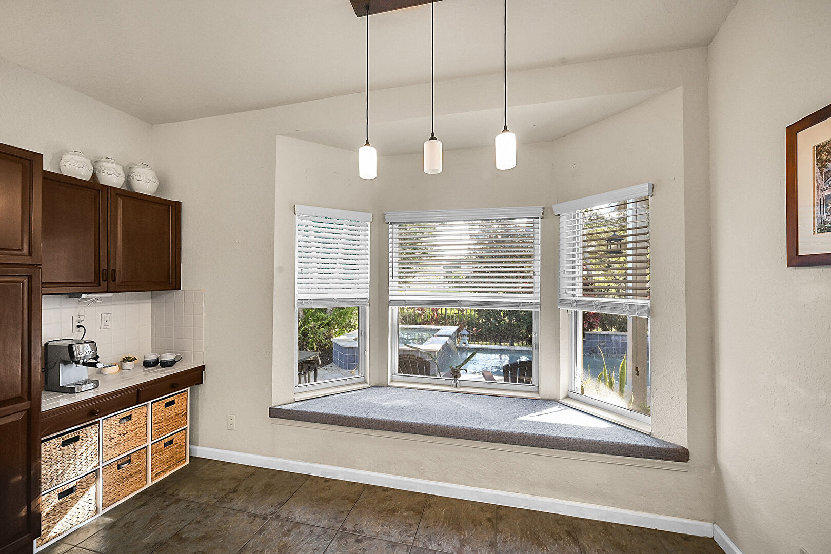 Arched Walkways, Baseboards Wall, Drywall, Glass Insert Cabinets, High Ceiling, Kitchen Bar, Kitchen Island, Medium Brown Cabinets, Natural Light, Pass Through Window, Pendant Lighting, Raised Cabinets, Recessed Lighting, Tile Countertops, U Shaped Kitchen, Vaulted Ceiling, Vent, Medium Brown Cabinets, Raised Cabinets