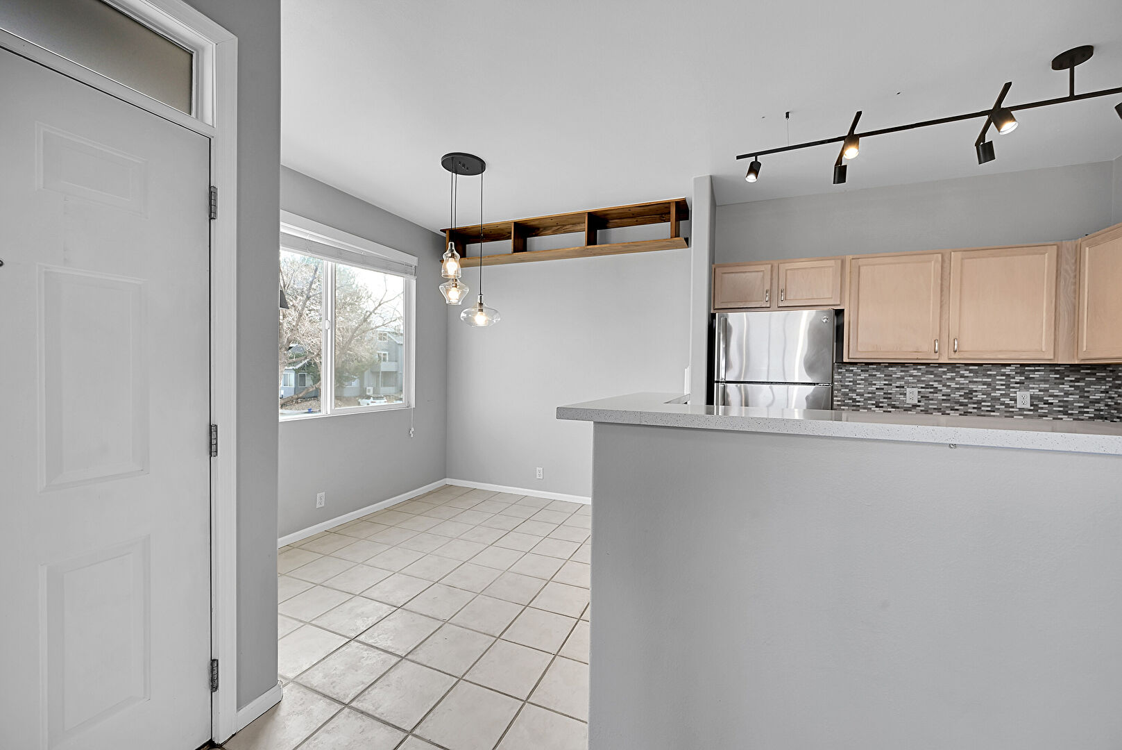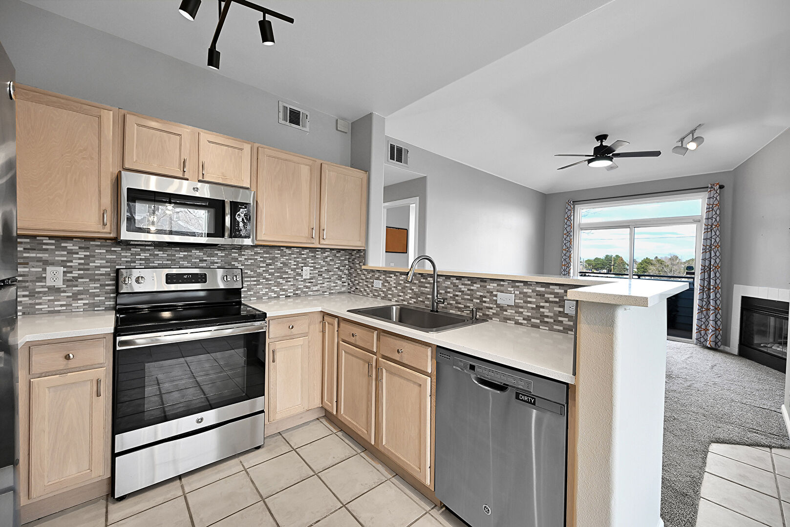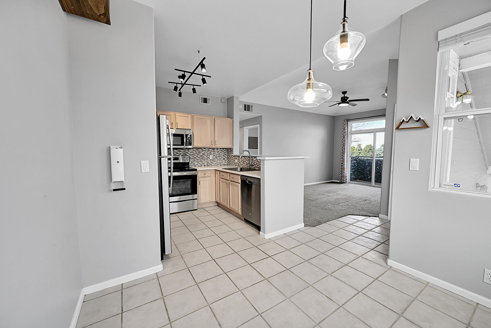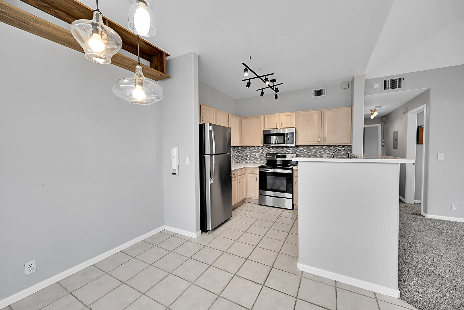 Baseboards Wall, Carpet, Ceiling Fan, Drywall, Fireplace, Kitchen Peninsula, Natural Light, Opens To Living Area, Pendant Lighting, Shaker Cabinets, Stone Countertops, Tile Floor, Track Lighting, U Shaped Kitchen, Vaulted Ceiling, Vent, Shaker Cabinets, Vent