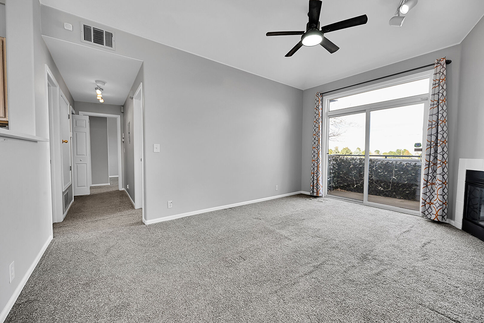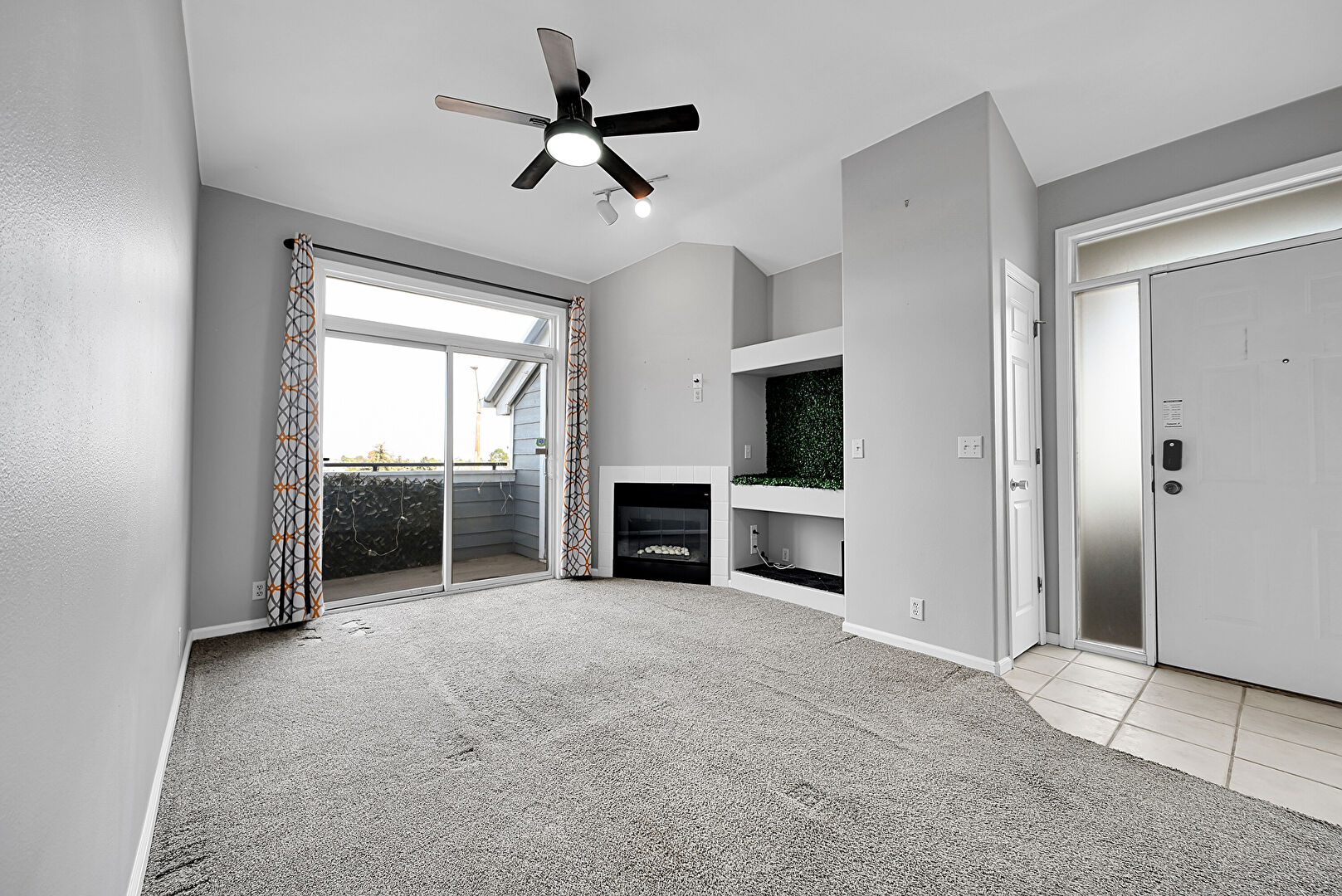 Baseboards Wall, Built In Shelves, Carpet, Ceiling Fan, Drywall, Fireplace, Natural Light, Tile Floor, Track Lighting, Baseboards Wall, Ceiling Fan, Natural Light, Vent