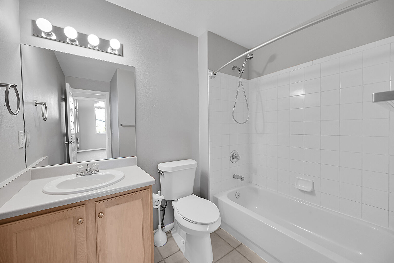 Baseboards Wall, Combined Bath Shower, Drywall, Tile Floor, Vanity, Full Bathroom