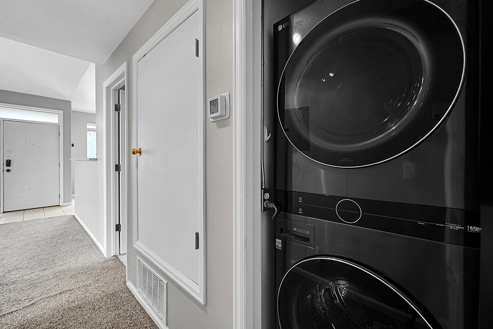 Baseboards Wall, Carpet, Laundry, Vaulted Ceiling, Vent, Drywall