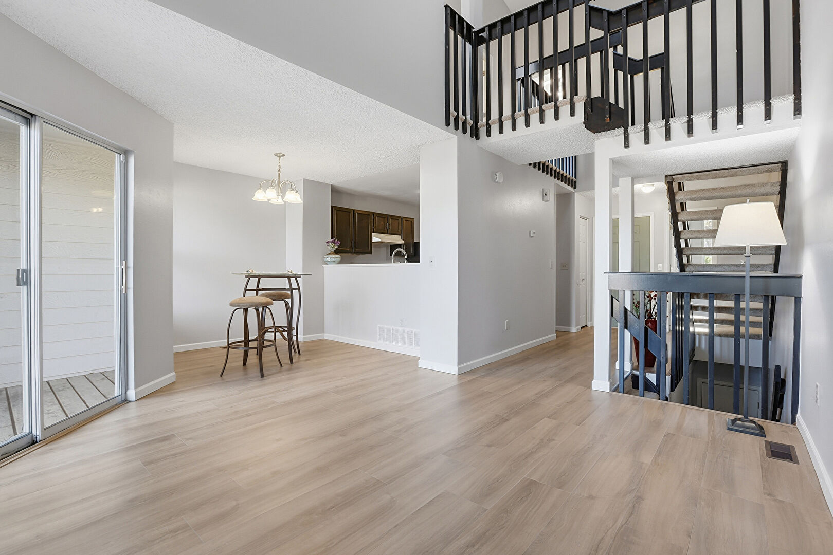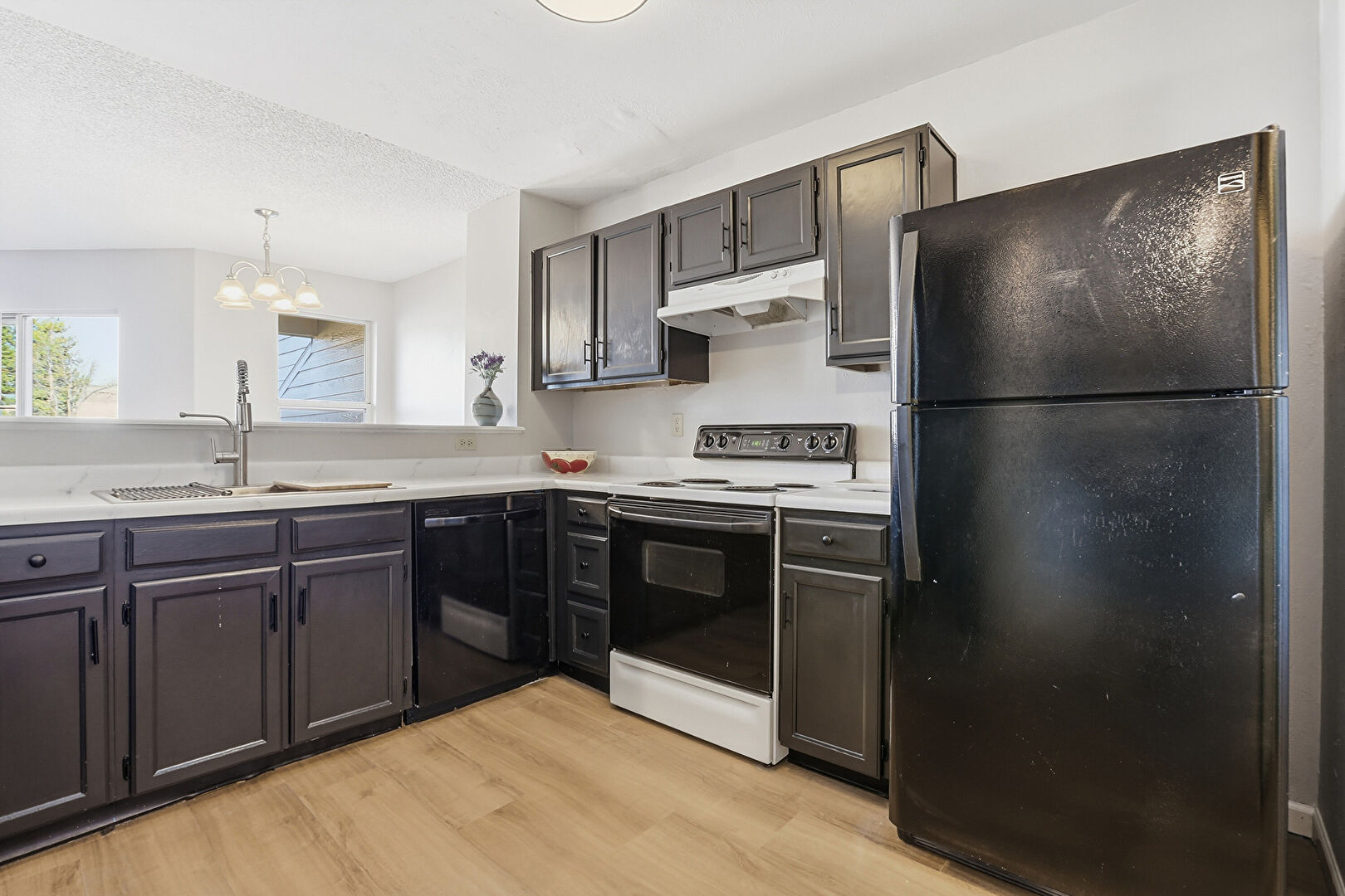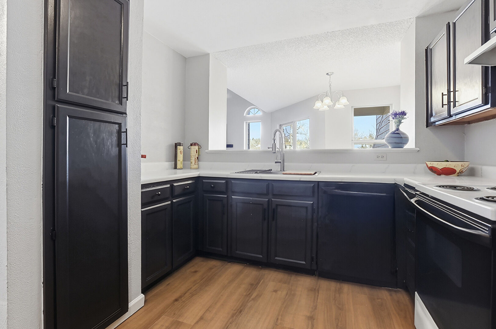 Black Cabinets, Drywall, Kitchen Peninsula, Natural Light, Notable Chandelier, Pass Through Window, Pendant Lighting, Shaker Cabinets, Textured Ceiling, Vaulted Ceiling, Wood Finish Floor, Textured Ceiling, Visible Hinge Cabinets