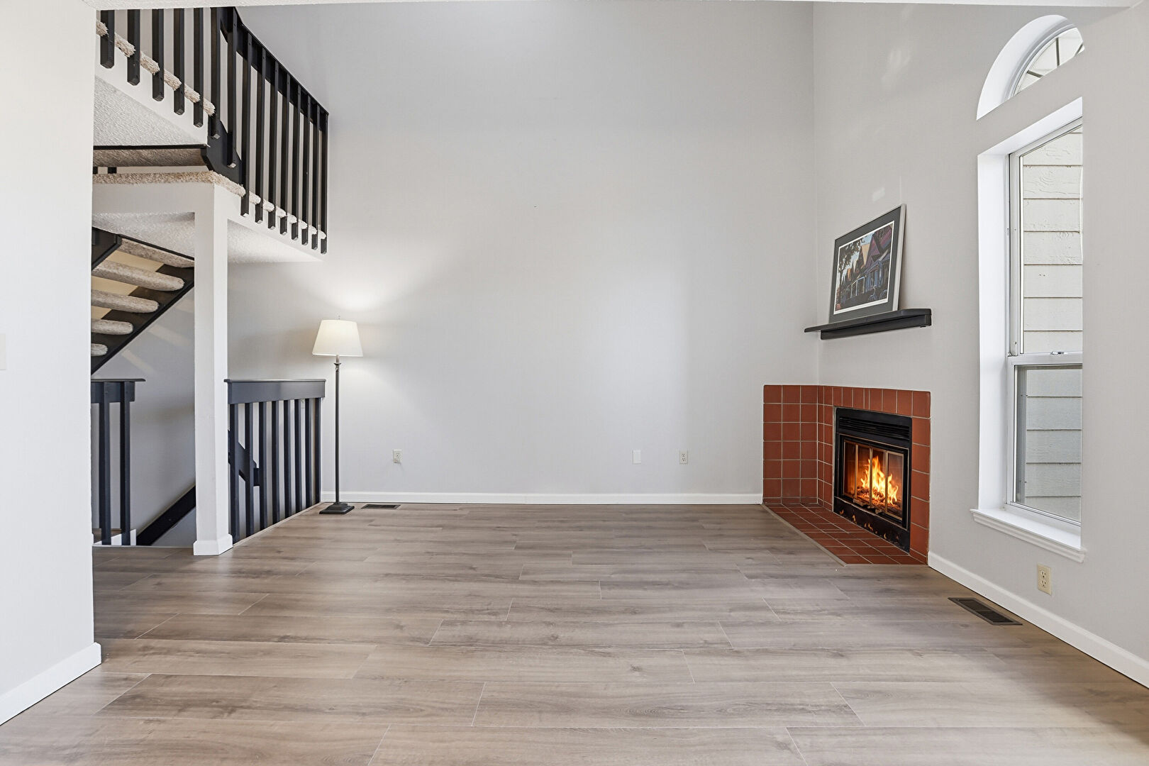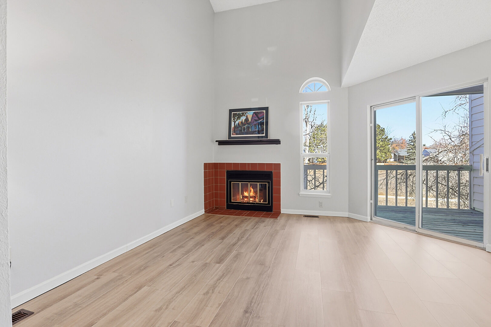Baseboards Wall, Drywall, Fireplace, High Ceiling, Natural Light, Notable Chandelier, Vaulted Ceiling, Vent, Wood Finish Floor, High Ceiling, Vent, Wood Finish Floor