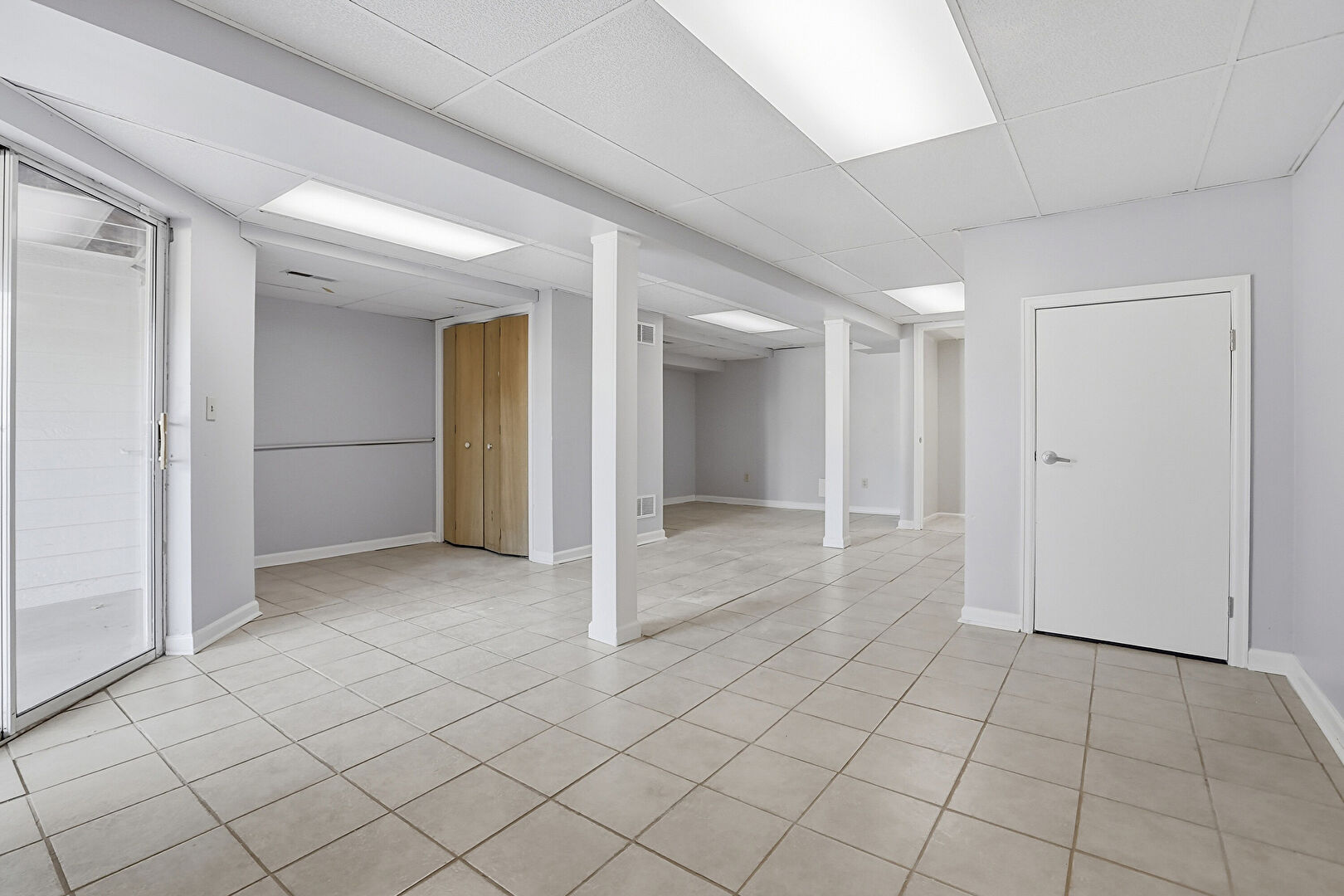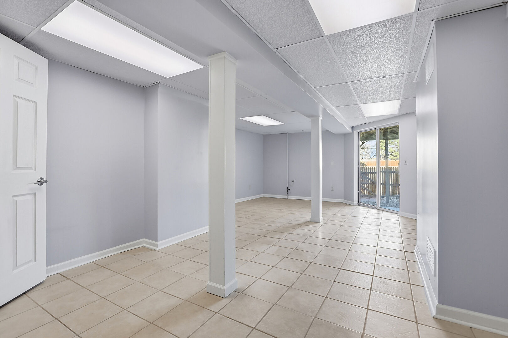 Baseboards Wall, Basement, Drop Ceiling, Drywall, Tile Floor, Vent, Basement, Natural Light