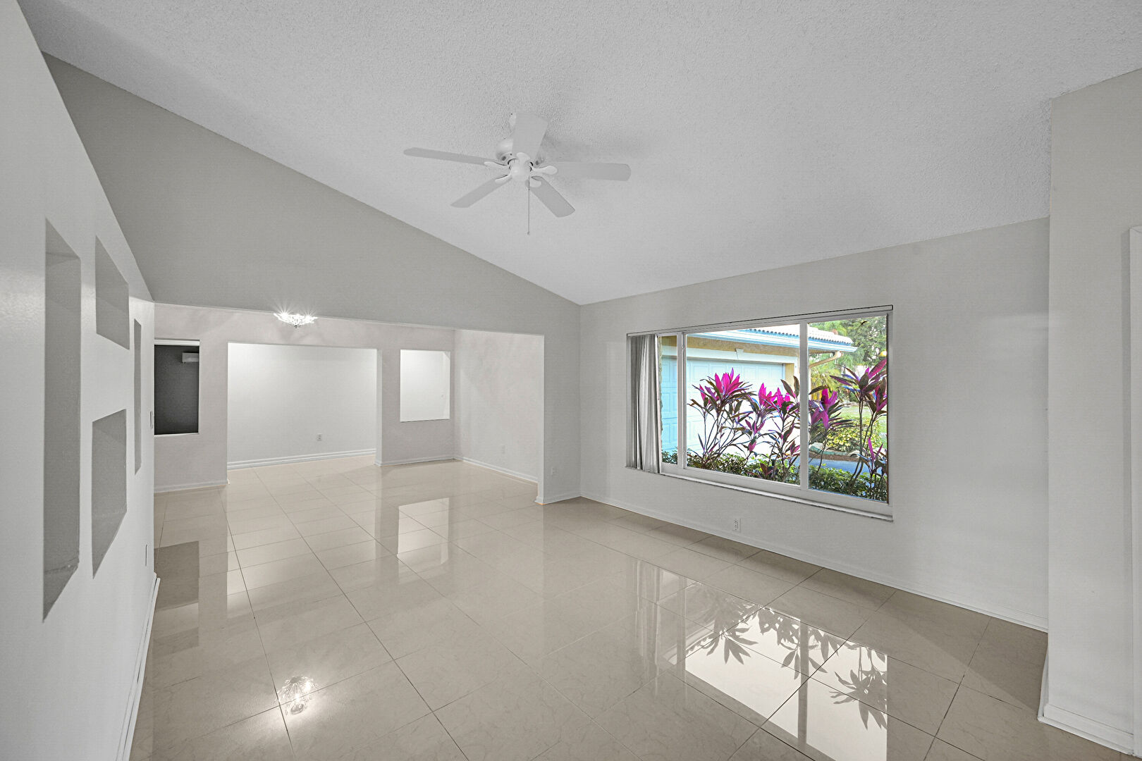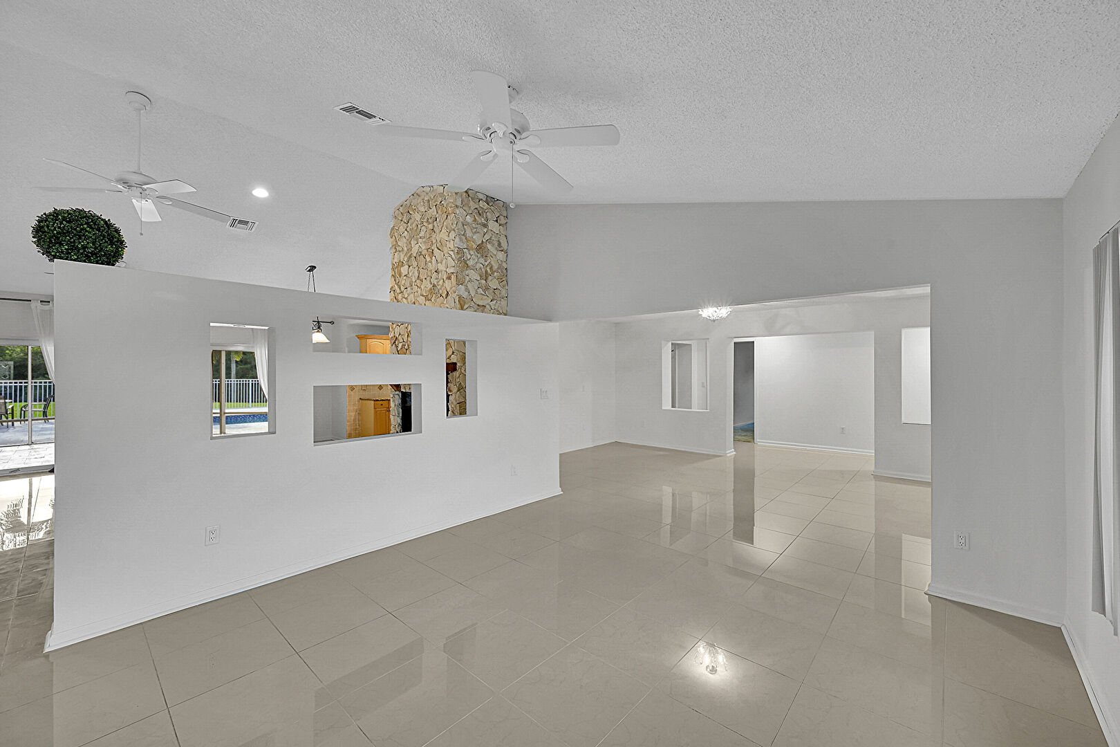 Baseboards Wall, Cathedral Ceiling, Ceiling Fan, Drywall, Fireplace, High Ceiling, Natural Light, Pool View, Recessed Lighting, Textured Ceiling, Tile Floor, U Shaped Kitchen, Vaulted Ceiling, Vent, Ceiling Fan, High Ceiling, Natural Light