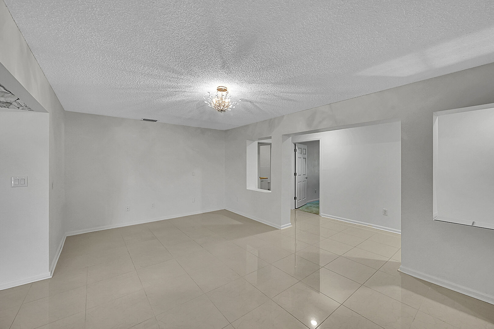 Baseboards Wall, Notable Chandelier, Textured Ceiling, Tile Floor, Vent, Drywall