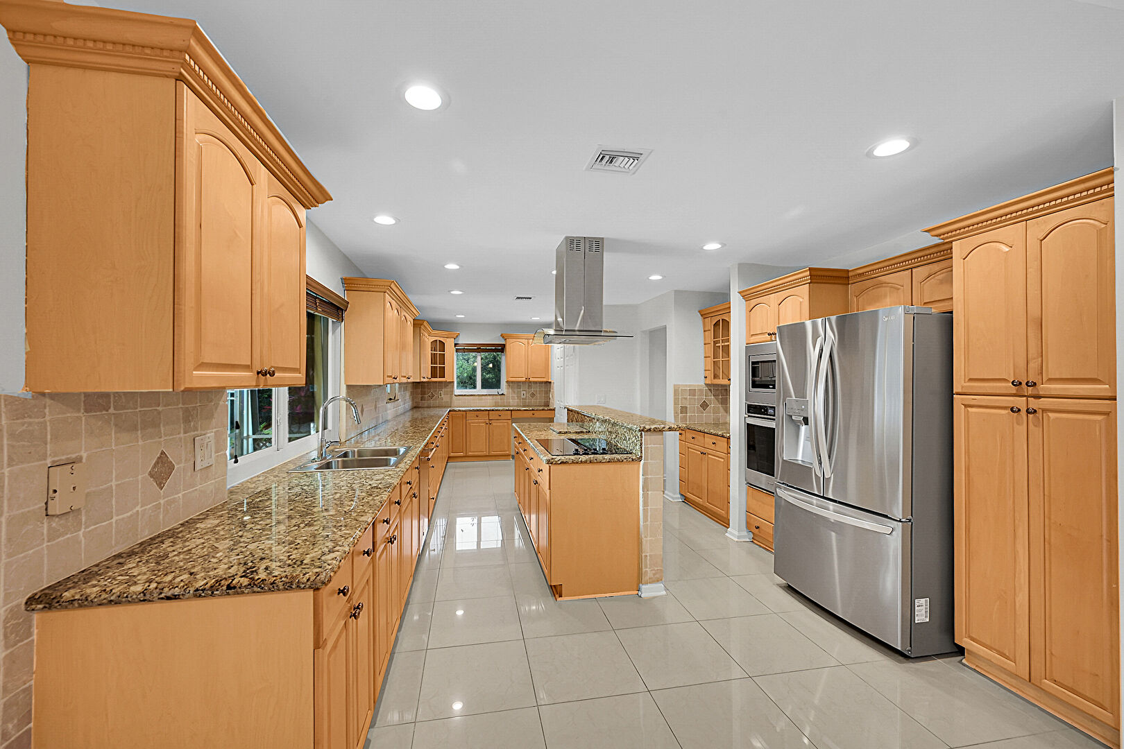 Arched Cabinets, Baseboards Wall, Crown Molding Cabinets, Drywall, Glass Insert Cabinets, Kitchen Bar, Kitchen Island, Natural Light, Raised Cabinets, Recessed Lighting, Stone Countertops, Tile Floor, U Shaped Kitchen, Vent, Ceiling Fan, Glass Insert Cabinets, Natural Light