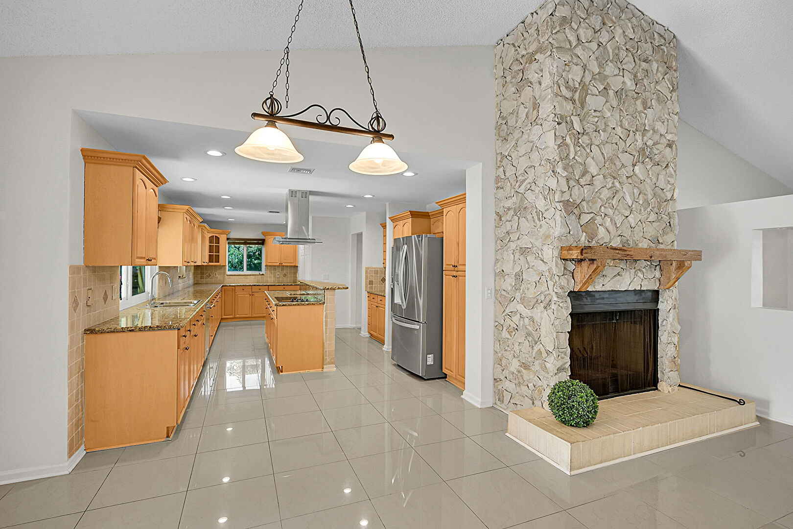 Arched Cabinets, Baseboards Wall, Crown Molding Cabinets, Drywall, Fireplace, Glass Insert Cabinets, High Ceiling, Kitchen Island, Natural Light, Pendant Lighting, Raised Cabinets, Recessed Lighting, Stone Countertops, Tile Floor, U Shaped Kitchen, Vaulted Ceiling, Vent