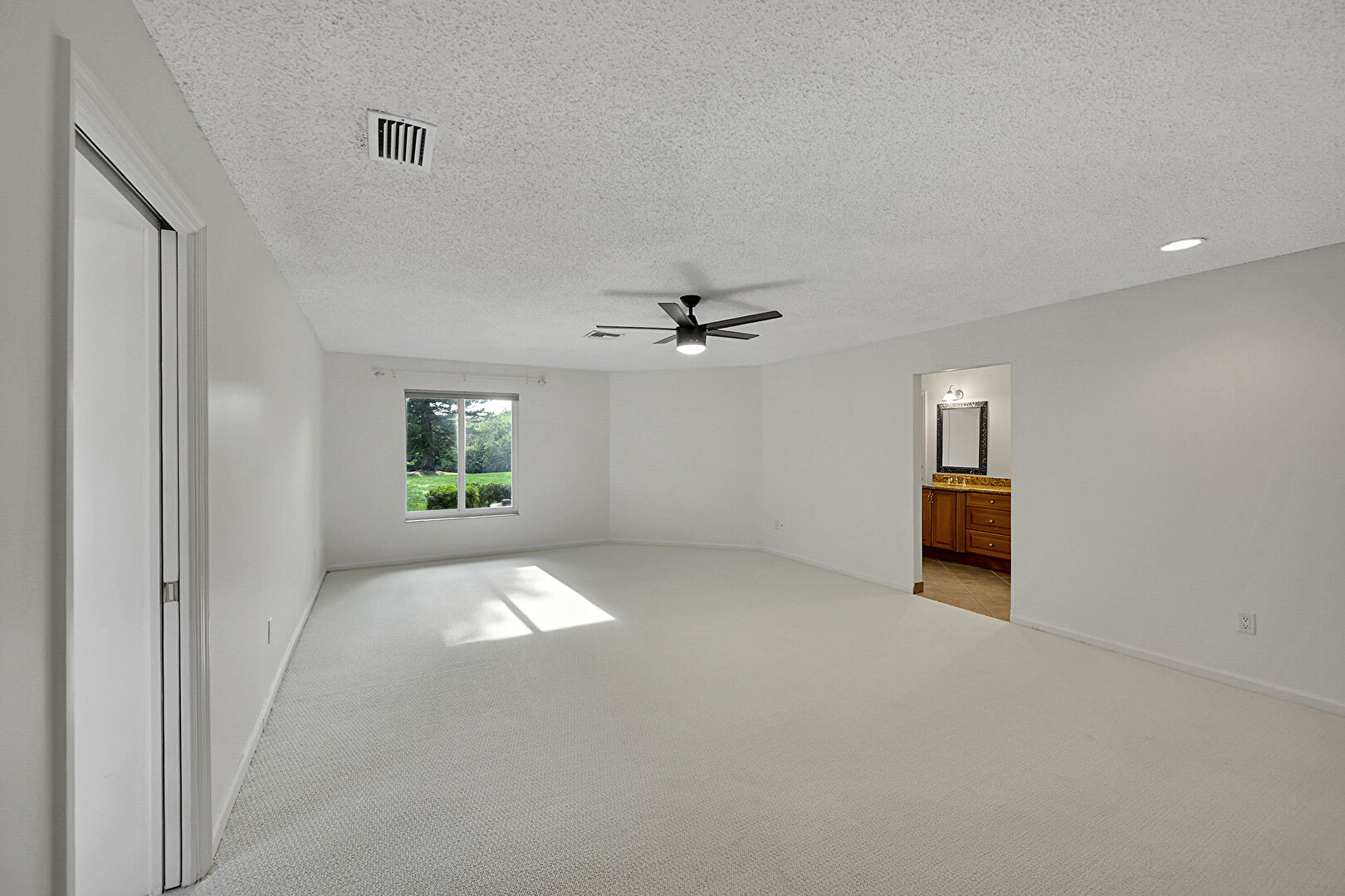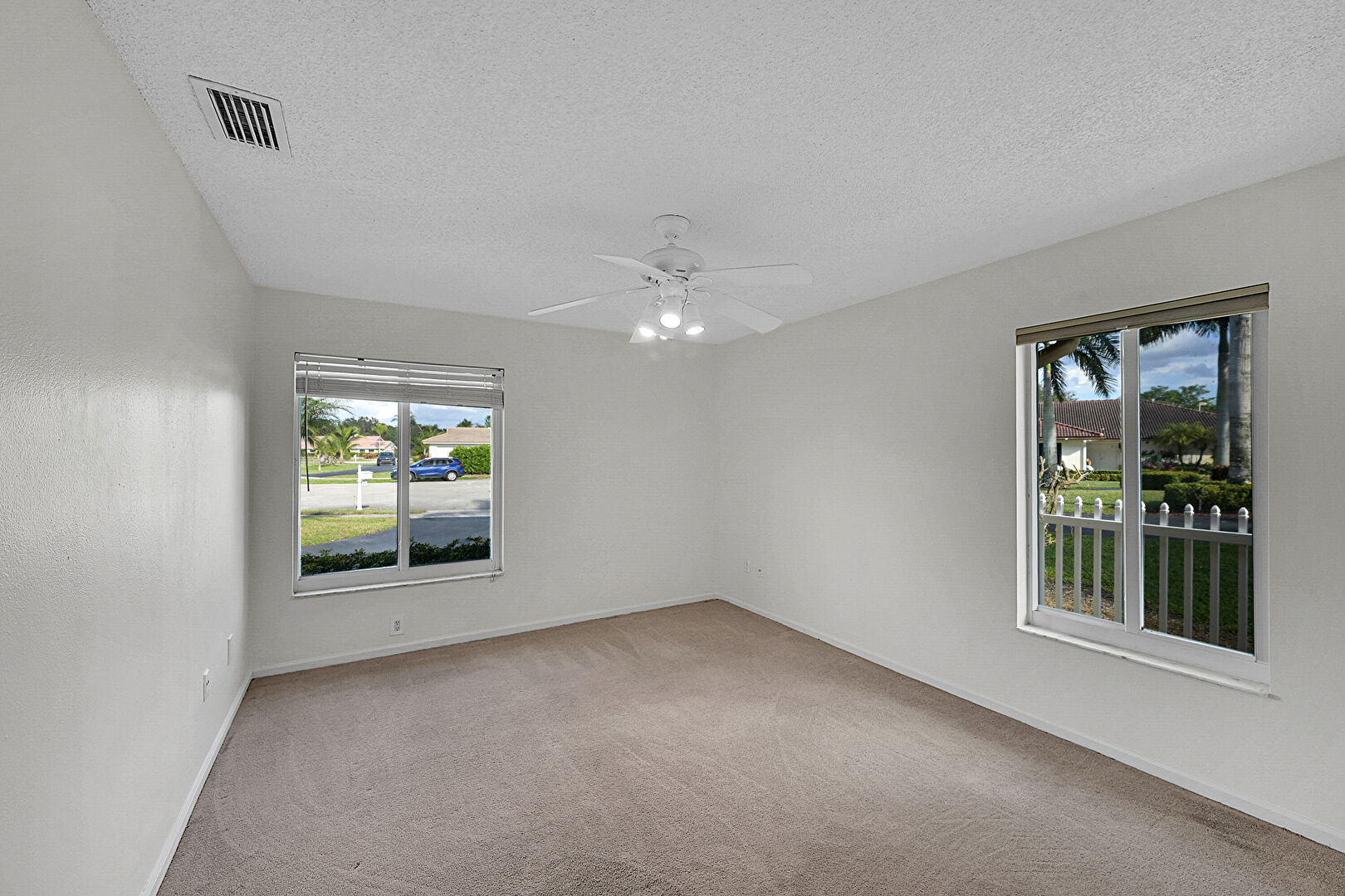 Baseboards Wall, Carpet, Ceiling Fan, Drywall, Natural Light, Vent, Textured Ceiling