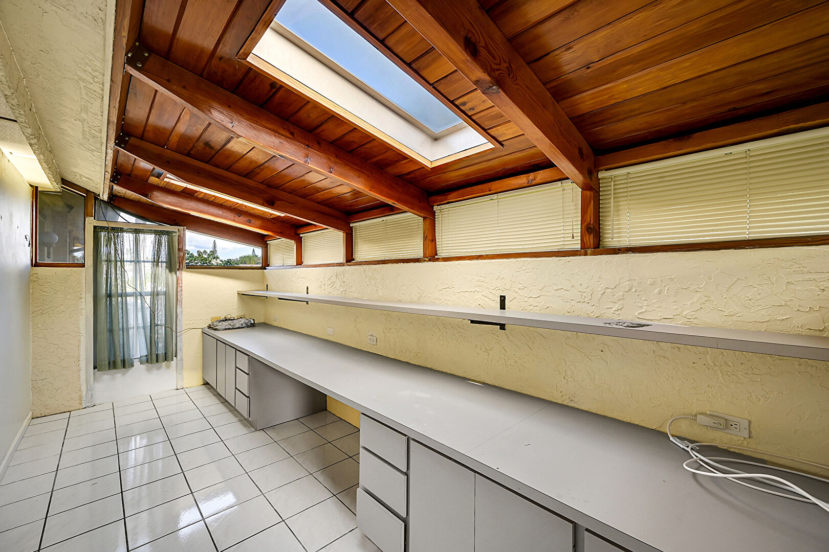 Beamed Ceiling, Skylight, Textured Wall, Tile Floor, Vaulted Ceiling, Wood Ceiling, Natural Light