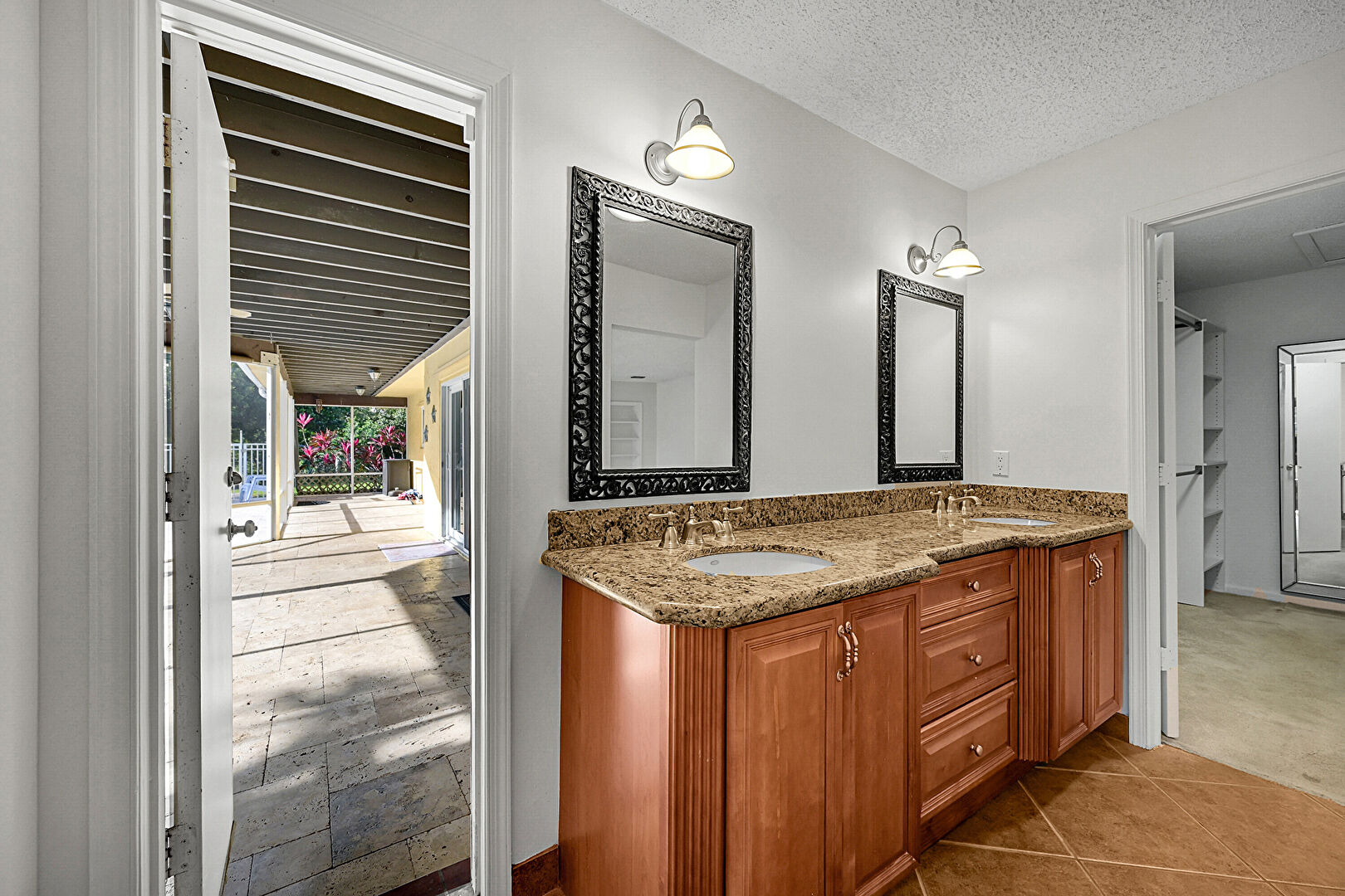 Double Vanity, Drywall, Full Bathroom, Natural Light, Textured Ceiling, Tile Floor, Walk In Closet, Closet