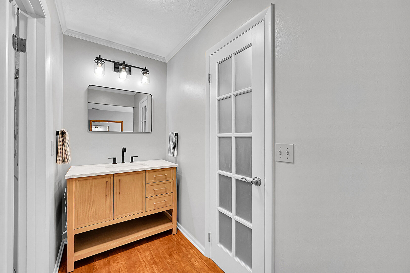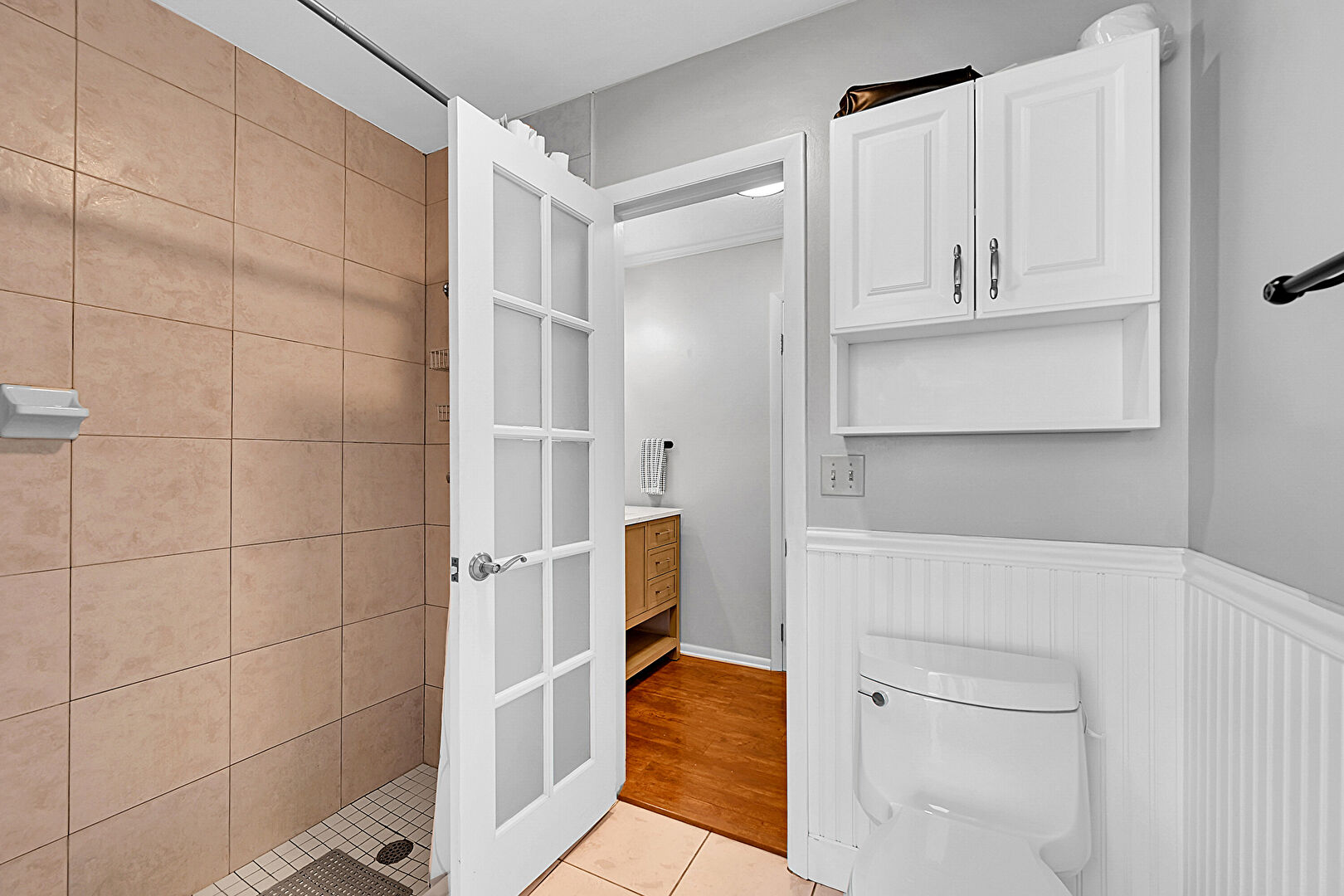 Baseboards Wall, Crown Molding, Drywall, Full Bathroom, Tile Floor, Vanity, Wood Finish Floor, Drywall, Wainscot Wall