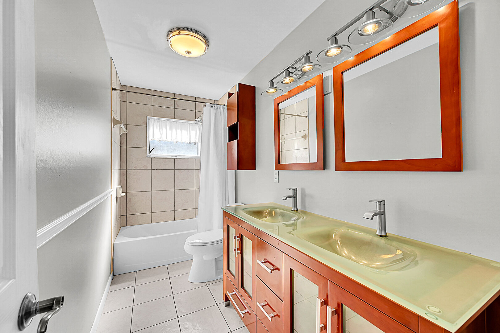 Baseboards Wall, Combined Bath Shower, Drywall, Full Bathroom, Natural Light, Tile Floor, Double Vanity