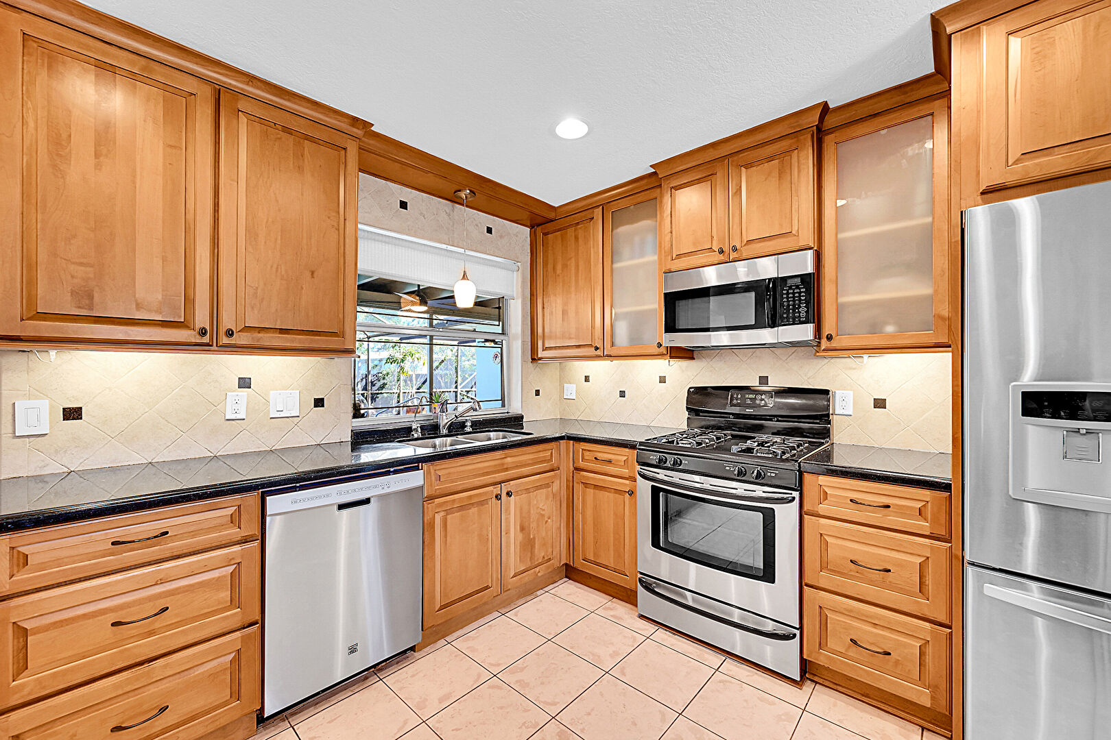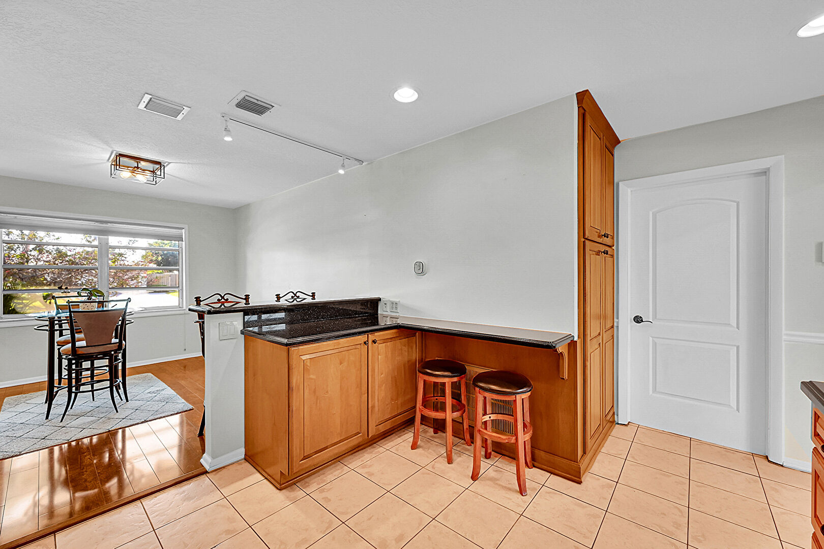 Baseboards Wall, Ceiling Fan, Crown Molding Cabinets, Drywall, Glass Insert Cabinets, Kitchen Bar, Kitchen Peninsula, Laundry, Medium Brown Cabinets, Natural Light, Open Shelves, Pendant Lighting, Raised Cabinets, Recessed Lighting, Stone Countertops, Textured Ceiling, Tile Floor, Track Lighting, Crown Molding Cabinets, Natural Light, Vent, Washer Hookup