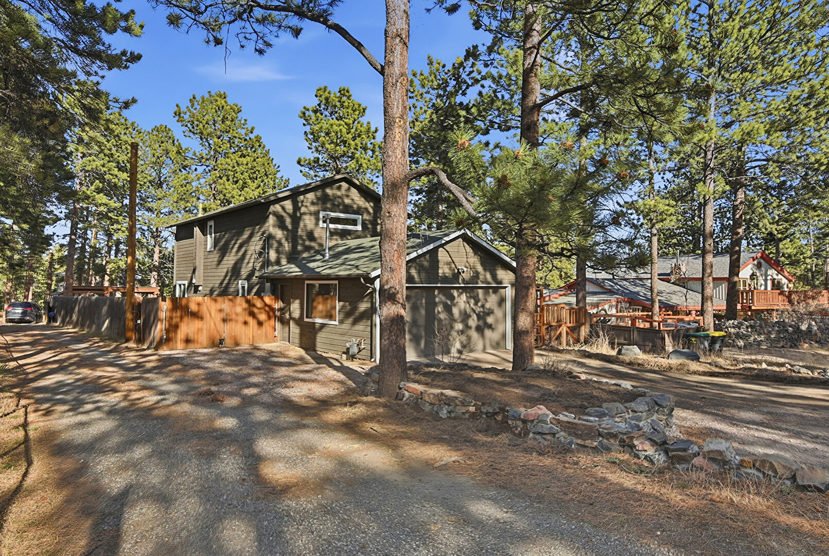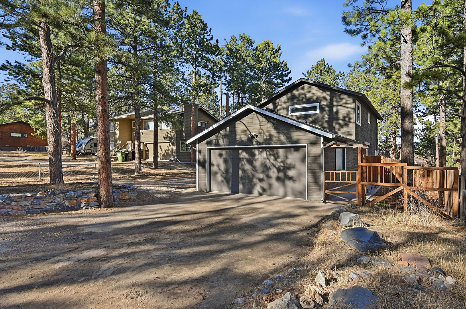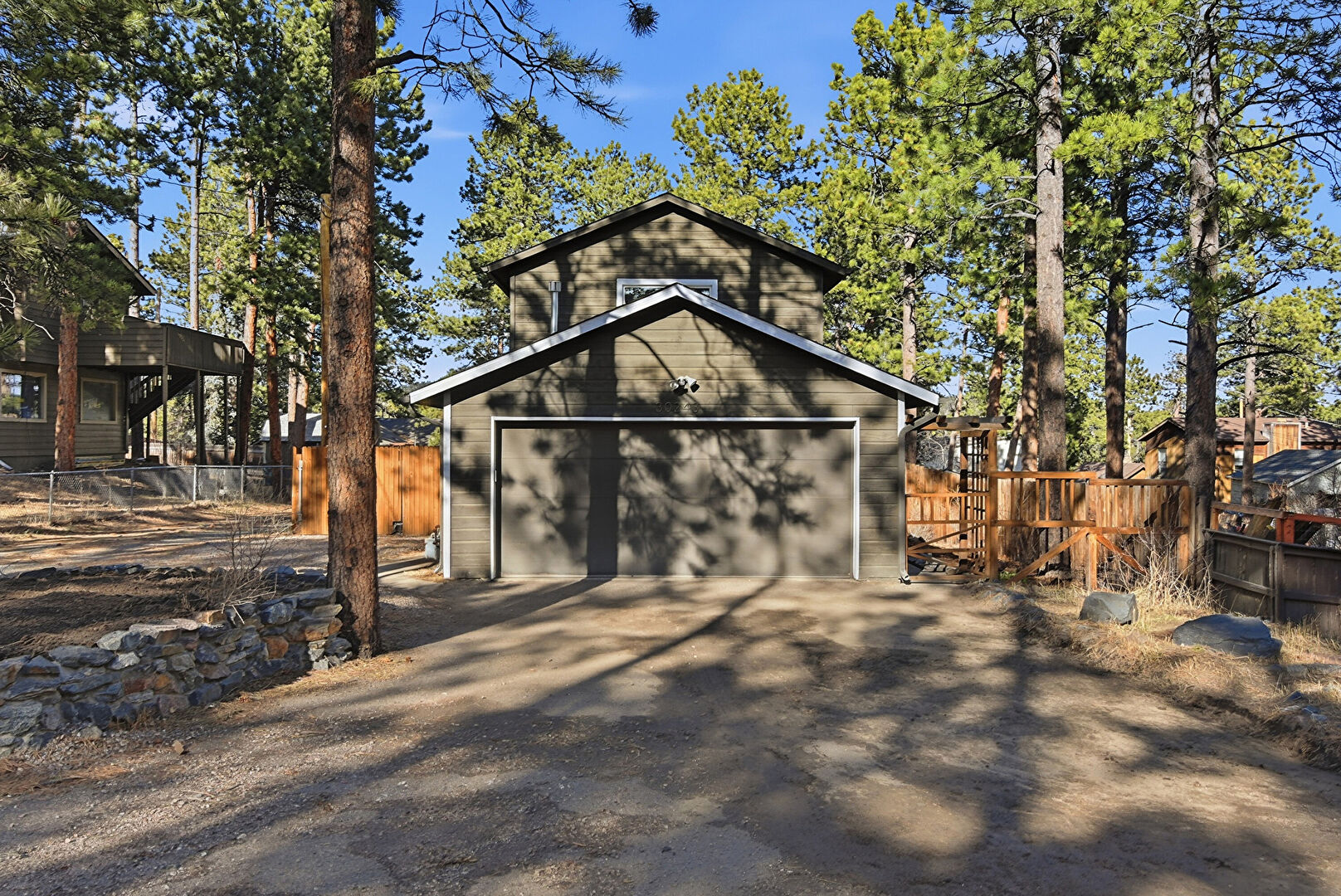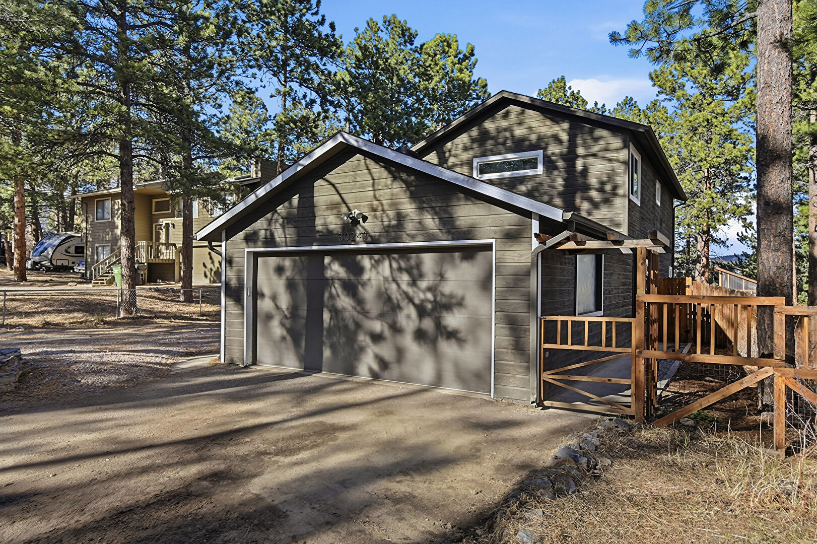 Deck, Downspout, Driveway, Fence, Garage, Gutters, Horizontal Siding, Outdoor Structure, Shingle Roof, Stone Siding, Woods View, Downspout, Driveway, Fence, Garage