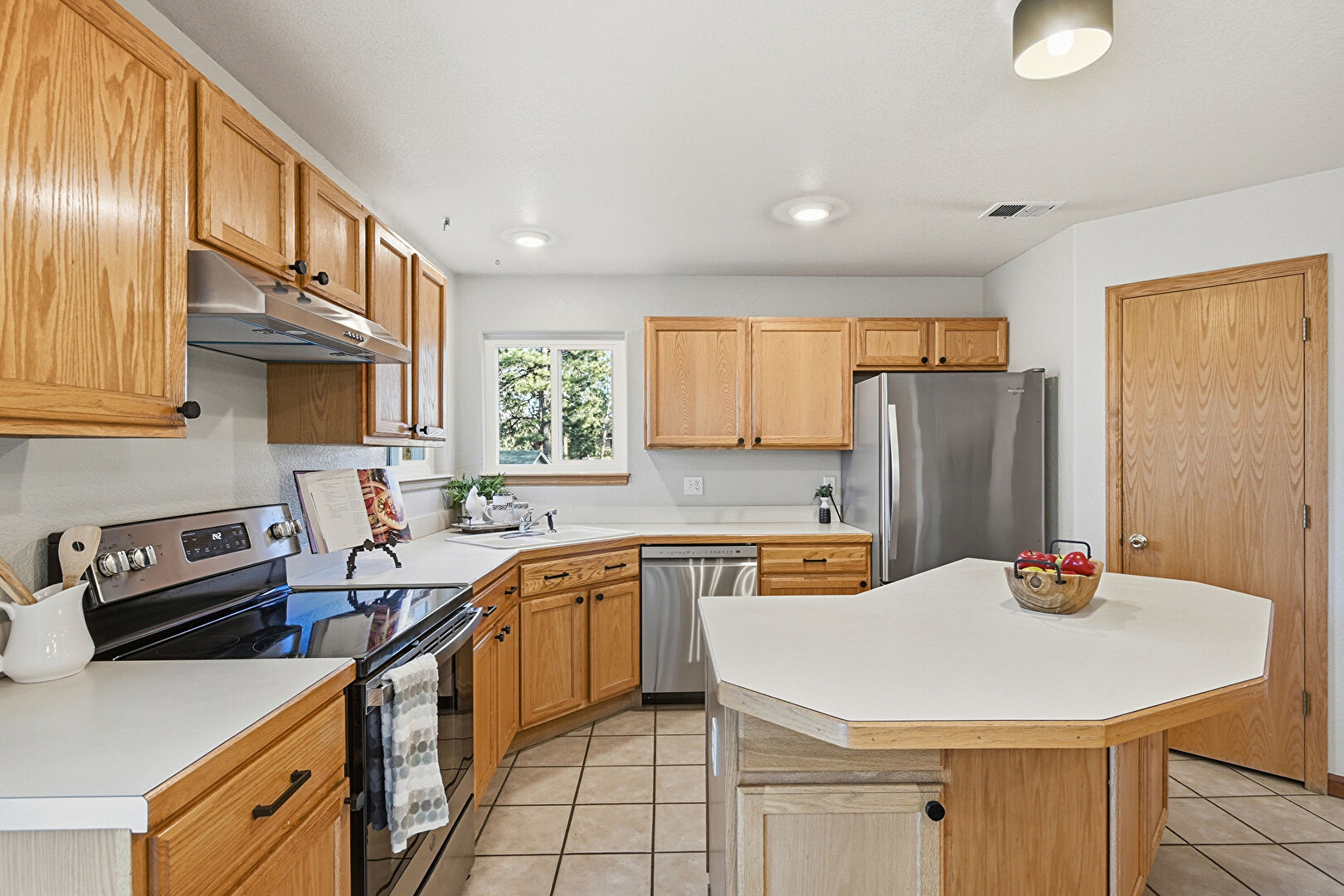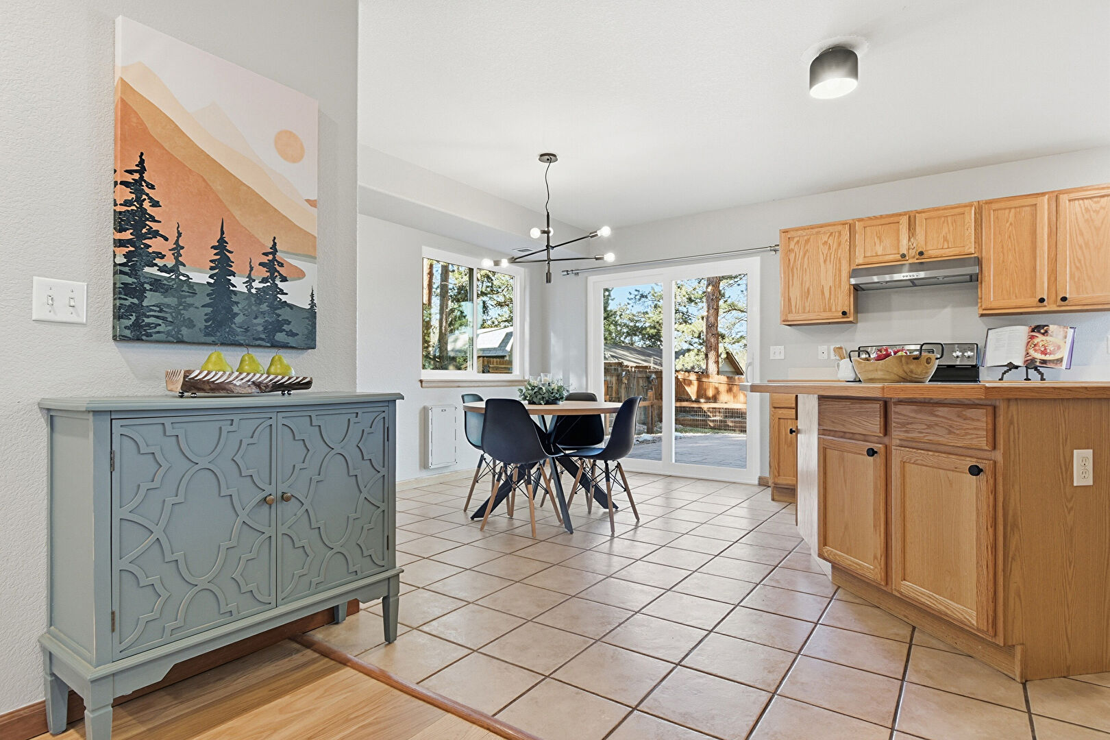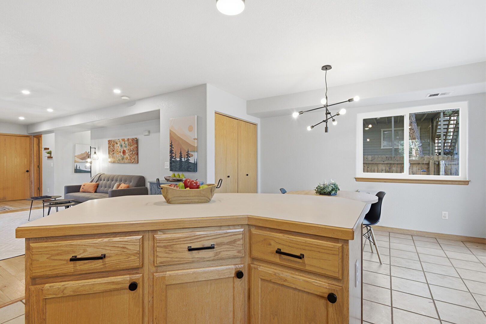 Baseboards Wall, Drywall, Kitchen Bar, Kitchen Island, L Shaped Kitchen, Medium Brown Cabinets, Natural Light, Notable Chandelier, Opens To Living Area, Pendant Lighting, Recessed Lighting, Shaker Cabinets, Textured Wall, Tile Floor, Vent, Wood Finish Floor, Drywall, Kitchen Bar, Kitchen Island, Medium Brown Cabinets, Notable Chandelier, Shaker Cabinets, Tile Floor