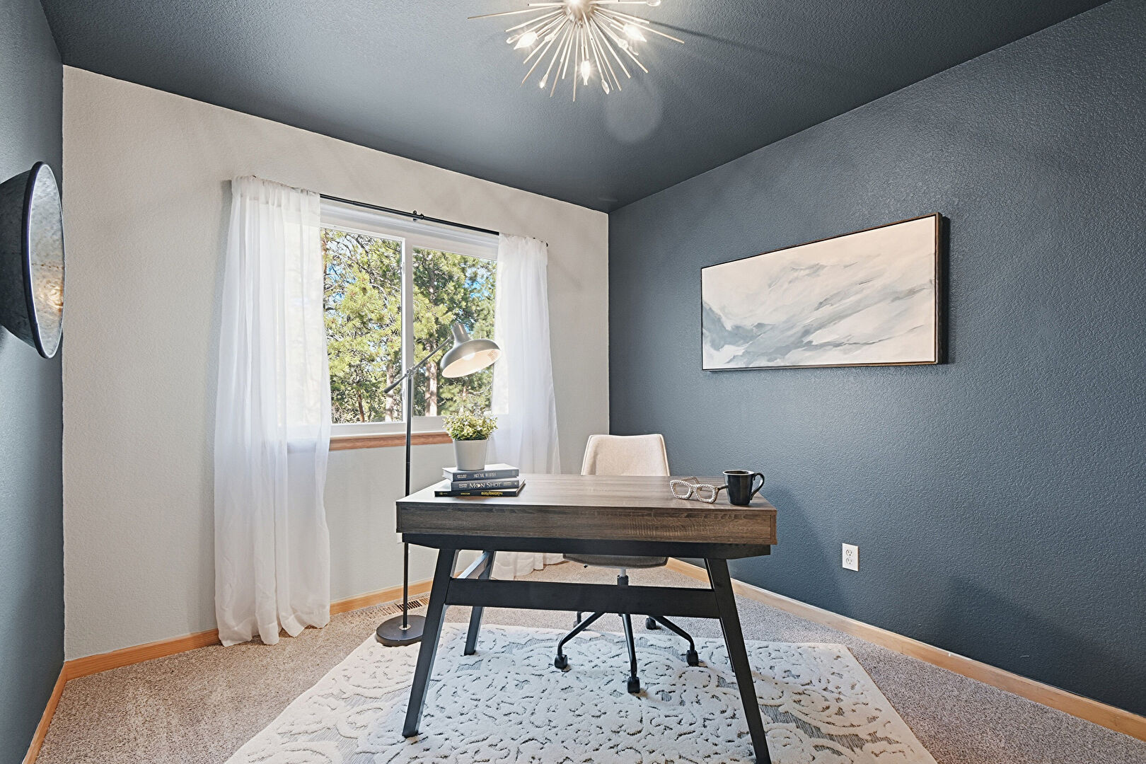Carpet, Natural Light, Notable Chandelier, Office Area, Textured Ceiling, Textured Wall, Baseboards Wall