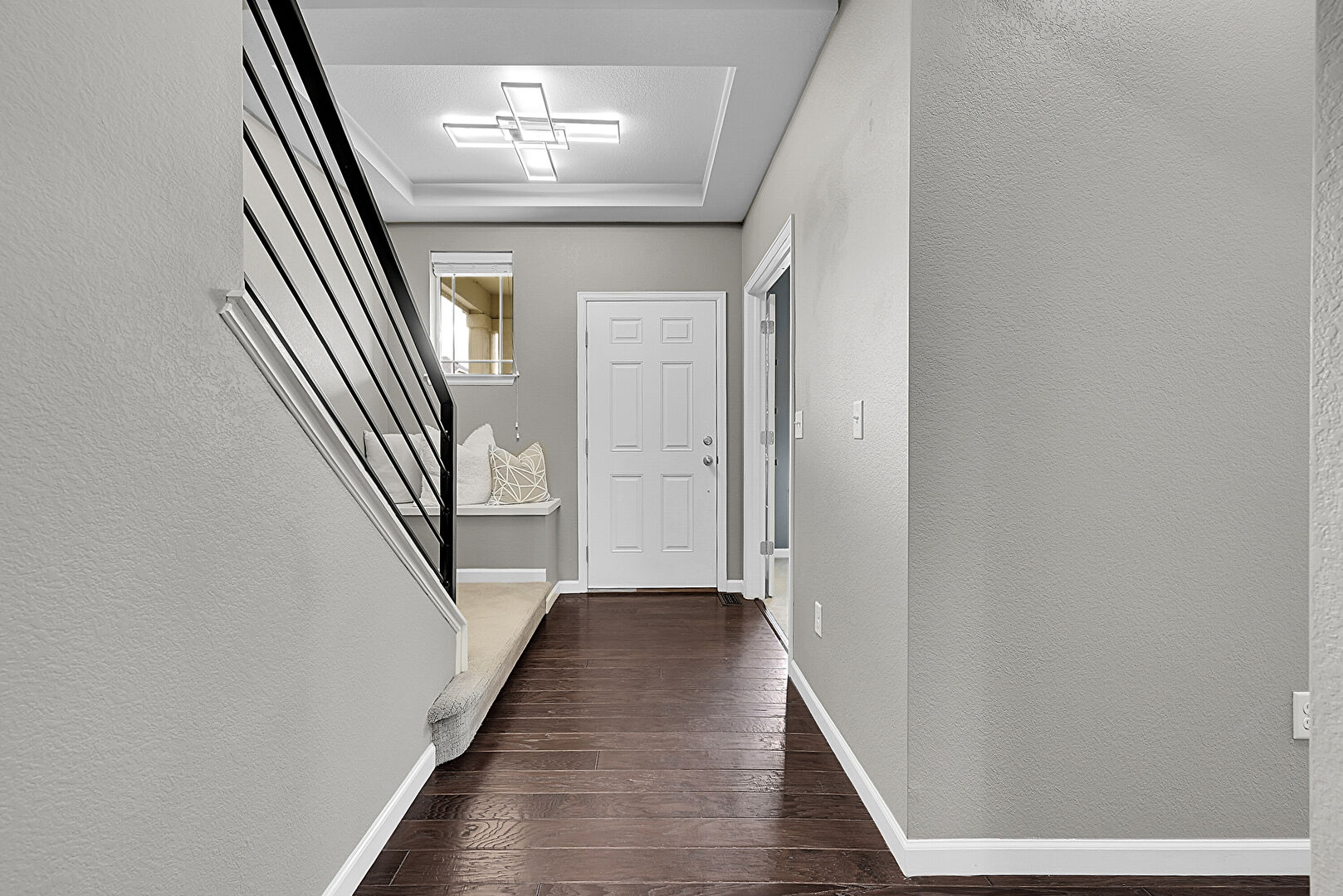 Baseboards Wall, Natural Light, Stairs, Textured Wall, Wood Finish Floor, Tray Ceiling